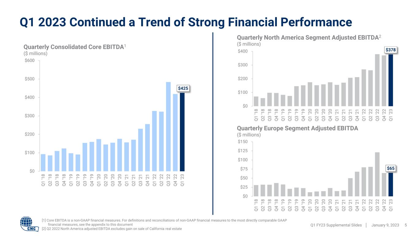 CMC’s trend of strong financial performance continued in Q1 2023 • Second best core EBITDA in Company history Divergence in market conditions between North America and Europe North America segment well positioned for 2023 • Internal leading indicators point toward resilience; backlog at historically high levels • Anticipate enlarged federal infrastructure package will impact construction activity starting in 2023 • Addition of Tensar and expected spring 2023 startup of Arizona 2 position CMC to capitalize on favorable market trends Good Europe segment performance in an uncertain economic environment • CMC has gained market share by leveraging its advantageous cost structure • Q1 adjusted EBITDA remained well above historical levels, but outlook appears less certain Strong financial position • Balance sheet strength and cash flow profile provide capital allocation flexibility Key Takeaways From Today’s Call Q1 FY23 Supplemental Slides │ January 9, 2023 4 $425 million Q1 Core EBITDA(1) 1 Core EBITDA , annualized return on invested capital, adjusted earnings, and adjusted EPS are non-GAAP financial measures. For definitions and reconciliations of non-GAAP financial measures to the most directly comparable GAAP financial measures, see the appendix to this document $266 million $2.24 23% Q1 Adjusted Earnings(1) Q1 Adjusted EPS(1) Q1 Annualized ROIC(1) ✔ ✔ ✔ ✔ ✔