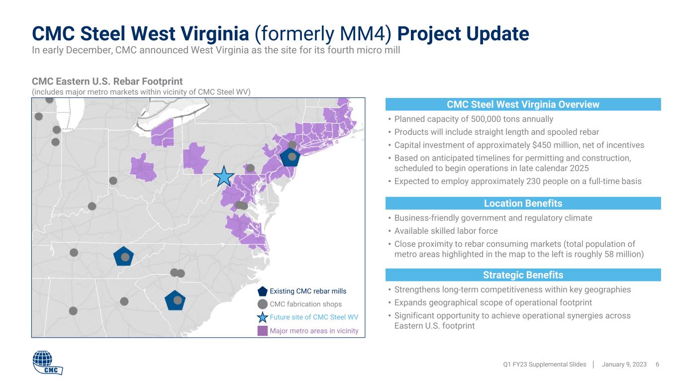 CMC Steel West Virginia (formerly MM4) Project Update Q1 FY23 Supplemental Slides │ January 9, 2023 6 In early December, CMC announced West Virginia as the site for its fourth micro mill Major metro areas in vicinity Existing CMC rebar mills CMC fabrication shops Future site of CMC Steel WV CMC Eastern U.S. Rebar Footprint (includes major metro markets within vicinity of CMC Steel WV) CMC Steel West Virginia Overview • Planned capacity of 500,000 tons annually • Products will include straight length and spooled rebar • Capital investment of approximately $450 million, net of incentives • Based on anticipated timelines for permitting and construction, scheduled to begin operations in late calendar 2025 • Expected to employ approximately 230 people on a full-time basis Location Benefits • Business-friendly government and regulatory climate • Available skilled labor force • Close proximity to rebar consuming markets (total population of metro areas highlighted in the map to the left is roughly 58 million) Strategic Benefits • Strengthens long-term competitiveness within key geographies • Expands geographical scope of operational footprint • Significant opportunity to achieve operational synergies across Eastern U.S. footprint