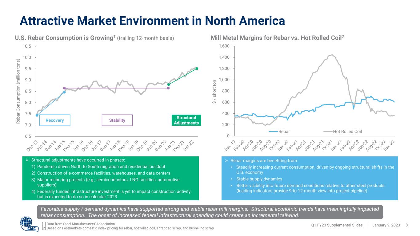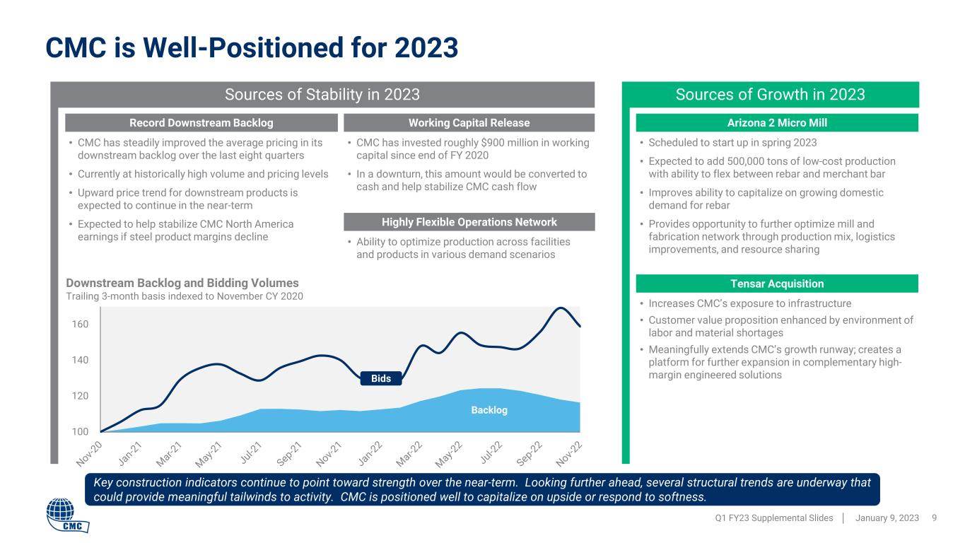Attractive Market Environment in North America Favorable supply / demand dynamics have supported strong and stable rebar mill margins. Structural economic trends have meaningfully impacted rebar consumption. The onset of increased federal infrastructural spending could create an incremental tailwind. Q1 FY23 Supplemental Slides │ January 9, 2023 8 6.5 7.0 7.5 8.0 8.5 9.0 9.5 10.0 10.5 Recovery Stability Structural Adjustments  Structural adjustments have occurred in phases: 1) Pandemic driven North to South migration and residential buildout 2) Construction of e-commerce facilities, warehouses, and data centers 3) Major reshoring projects (e.g., semiconductors, LNG facilities, automotive suppliers) 4) Federally funded infrastructure investment is yet to impact construction activity, but is expected to do so in calendar 2023 Re ba r C on su m pt io n (m ill io n to ns ) U.S. Rebar Consumption is Growing1 (trailing 12-month basis) 0 200 400 600 800 1,000 1,200 1,400 1,600 Rebar Hot Rolled Coil  Rebar margins are benefiting from: • Steadily increasing current consumption, driven by ongoing structural shifts in the U.S. economy • Stable supply dynamics • Better visibility into future demand conditions relative to other steel products (leading indicators provide 9-to-12-month view into project pipeline) Mill Metal Margins for Rebar vs. Hot Rolled Coil2 $ / s ho rt to n [1] Data from Steel Manufacturers’ Association [2] Based on Fastmarkets domestic index pricing for rebar, hot rolled coil, shredded scrap, and busheling scrap