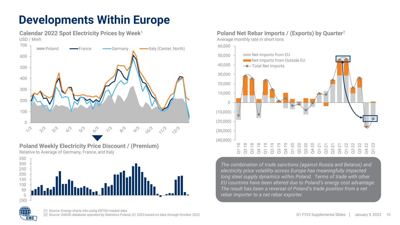 100 120 140 160 Backlog Bids CMC is Well-Positioned for 2023 Key construction indicators continue to point toward strength over the near-term. Looking further ahead, several structural trends are underway that could provide meaningful tailwinds to activity. CMC is positioned well to capitalize on upside or respond to softness. Q1 FY23 Supplemental Slides │ January 9, 2023 9 Arizona 2 Micro Mill • Scheduled to start up in spring 2023 • Expected to add 500,000 tons of low-cost production with ability to flex between rebar and merchant bar • Improves ability to capitalize on growing domestic demand for rebar • Provides opportunity to further optimize mill and fabrication network through production mix, logistics improvements, and resource sharing Tensar Acquisition • Increases CMC’s exposure to infrastructure • Customer value proposition enhanced by environment of labor and material shortages • Meaningfully extends CMC’s growth runway; creates a platform for further expansion in complementary high- margin engineered solutions Record Downstream Backlog • CMC has steadily improved the average pricing in its downstream backlog over the last eight quarters • Currently at historically high volume and pricing levels • Upward price trend for downstream products is expected to continue in the near-term • Expected to help stabilize CMC North America earnings if steel product margins decline Working Capital Release • CMC has invested roughly $900 million in working capital since end of FY 2020 • In a downturn, this amount would be converted to cash and help stabilize CMC cash flow Highly Flexible Operations Network • Ability to optimize production across facilities and products in various demand scenarios Sources of Growth in 2023Sources of Stability in 2023 Downstream Backlog and Bidding Volumes Trailing 3-month basis indexed to November CY 2020