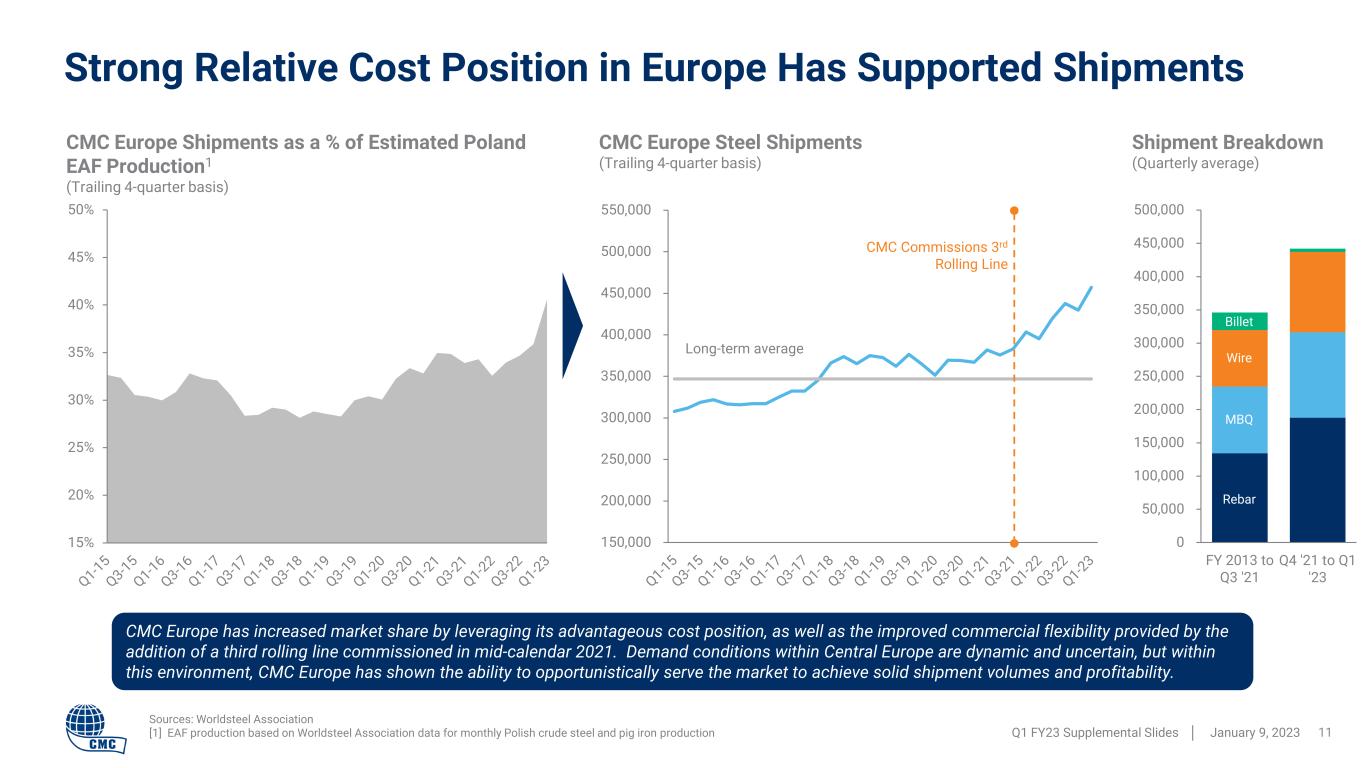 (40,000) (30,000) (20,000) (10,000) 0 10,000 20,000 30,000 40,000 50,000 60,000 Q 1- 18 Q 2- 18 Q 3- 18 Q 4- 18 Q 1- 19 Q 2- 19 Q 3- 19 Q 4- 19 Q 1- 20 Q 2- 20 Q 3- 20 Q 4- 20 Q 1- 21 Q 2- 21 Q 3- 21 Q 4- 21 Q 1- 22 Q 2- 22 Q 3- 22 Q 4- 22 Q 1- 23 Net Imports from EU Net Imports from Outside EU Total Net Imports Developments Within Europe Q1 FY23 Supplemental Slides │ January 9, 2023 10 Calendar 2022 Spot Electricity Prices by Week1 USD / Mwh [1] Source: Energy-charts.info using ENTSO market data [2] Source: SWAID database operated by Statistics Poland; Q1 2023 based on data through October 2022 0 100 200 300 400 500 600 700 Poland France Germany Italy (Center, North) (50) 0 50 100 150 200 250 300 350 Poland Weekly Electricity Price Discount / (Premium) Relative to Average of Germany, France, and Italy Poland Net Rebar Imports / (Exports) by Quarter2 Average monthly rate in short tons The combination of trade sanctions (against Russia and Belarus) and electricity price volatility across Europe has meaningfully impacted long steel supply dynamics within Poland. Terms of trade with other EU countries have been altered due to Poland’s energy cost advantage. The result has been a reversal of Poland’s trade position from a net rebar importer to a net rebar exporter.