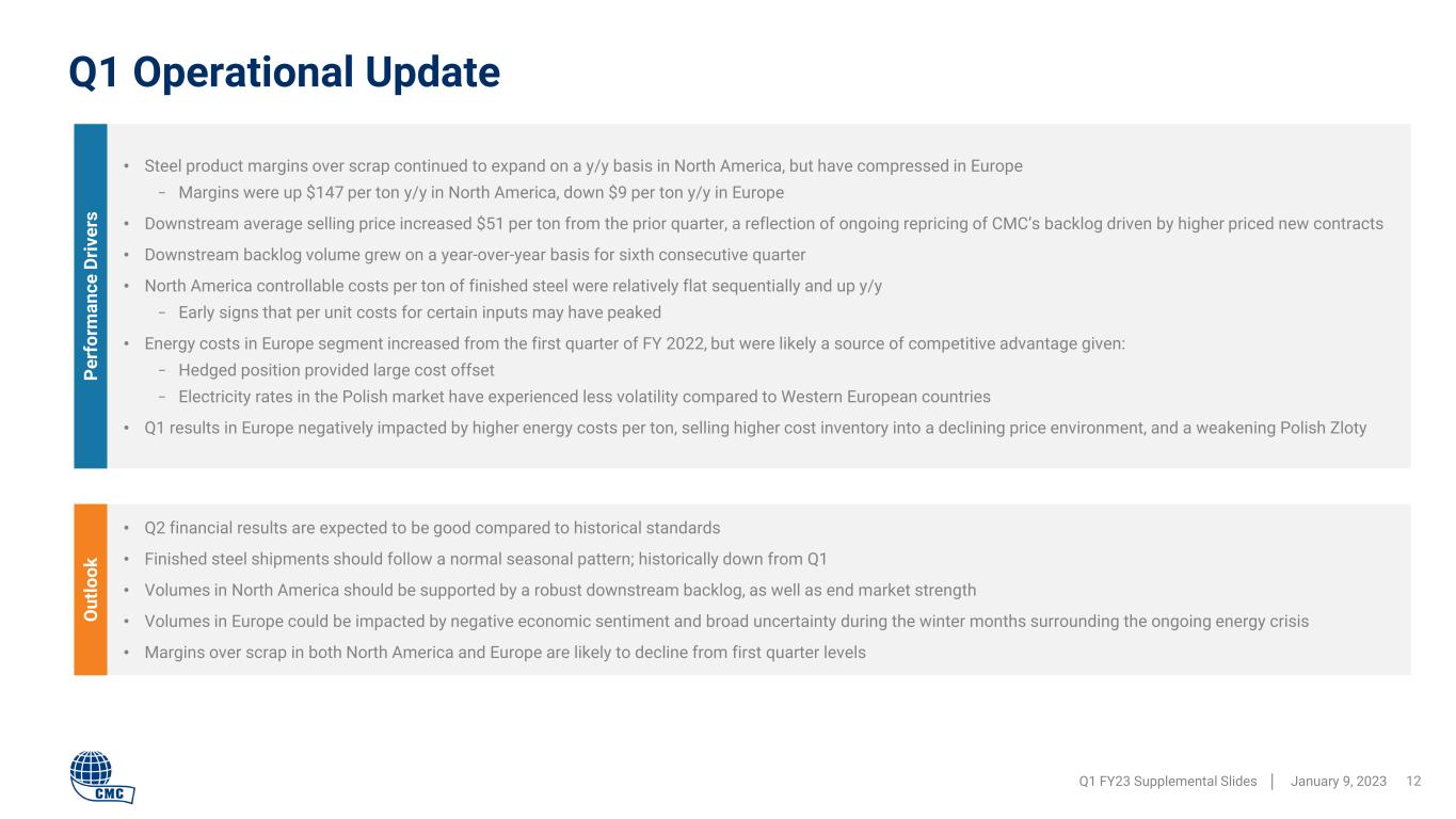 0 50,000 100,000 150,000 200,000 250,000 300,000 350,000 400,000 450,000 500,000 FY 2013 to Q3 '21 Q4 '21 to Q1 '23 150,000 200,000 250,000 300,000 350,000 400,000 450,000 500,000 550,000 Strong Relative Cost Position in Europe Has Supported Shipments Q1 FY23 Supplemental Slides │ January 9, 2023 11 CMC Europe Shipments as a % of Estimated Poland EAF Production1 (Trailing 4-quarter basis) Sources: Worldsteel Association [1] EAF production based on Worldsteel Association data for monthly Polish crude steel and pig iron production 15% 20% 25% 30% 35% 40% 45% 50% Long-term average CMC Commissions 3rd Rolling Line CMC Europe Steel Shipments (Trailing 4-quarter basis) Rebar MBQ Wire Billet Shipment Breakdown (Quarterly average) CMC Europe has increased market share by leveraging its advantageous cost position, as well as the improved commercial flexibility provided by the addition of a third rolling line commissioned in mid-calendar 2021. Demand conditions within Central Europe are dynamic and uncertain, but within this environment, CMC Europe has shown the ability to opportunistically serve the market to achieve solid shipment volumes and profitability.