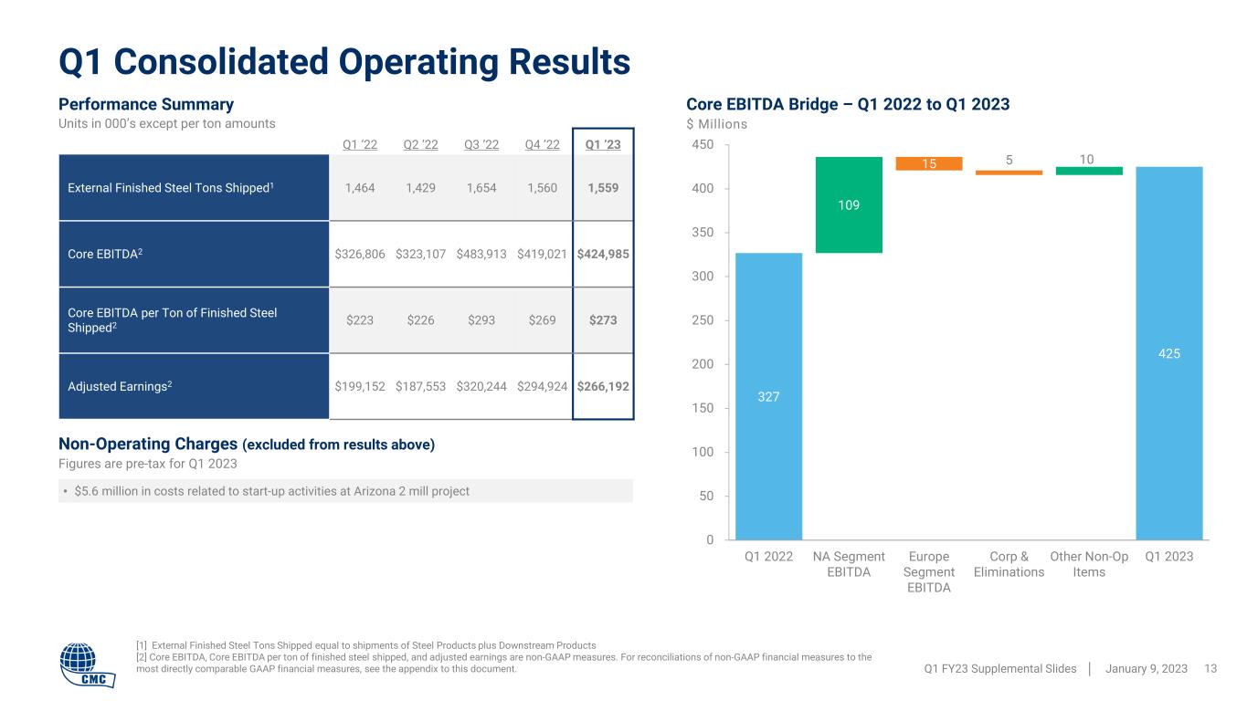 • Steel product margins over scrap continued to expand on a y/y basis in North America, but have compressed in Europe − Margins were up $147 per ton y/y in North America, down $9 per ton y/y in Europe • Downstream average selling price increased $51 per ton from the prior quarter, a reflection of ongoing repricing of CMC’s backlog driven by higher priced new contracts • Downstream backlog volume grew on a year-over-year basis for sixth consecutive quarter • North America controllable costs per ton of finished steel were relatively flat sequentially and up y/y − Early signs that per unit costs for certain inputs may have peaked • Energy costs in Europe segment increased from the first quarter of FY 2022, but were likely a source of competitive advantage given: − Hedged position provided large cost offset − Electricity rates in the Polish market have experienced less volatility compared to Western European countries • Q1 results in Europe negatively impacted by higher energy costs per ton, selling higher cost inventory into a declining price environment, and a weakening Polish Zloty • Q2 financial results are expected to be good compared to historical standards • Finished steel shipments should follow a normal seasonal pattern; historically down from Q1 • Volumes in North America should be supported by a robust downstream backlog, as well as end market strength • Volumes in Europe could be impacted by negative economic sentiment and broad uncertainty during the winter months surrounding the ongoing energy crisis • Margins over scrap in both North America and Europe are likely to decline from first quarter levels Pe rf or m an ce D riv er s O ut lo ok Q1 Operational Update Q1 FY23 Supplemental Slides │ January 9, 2023 12