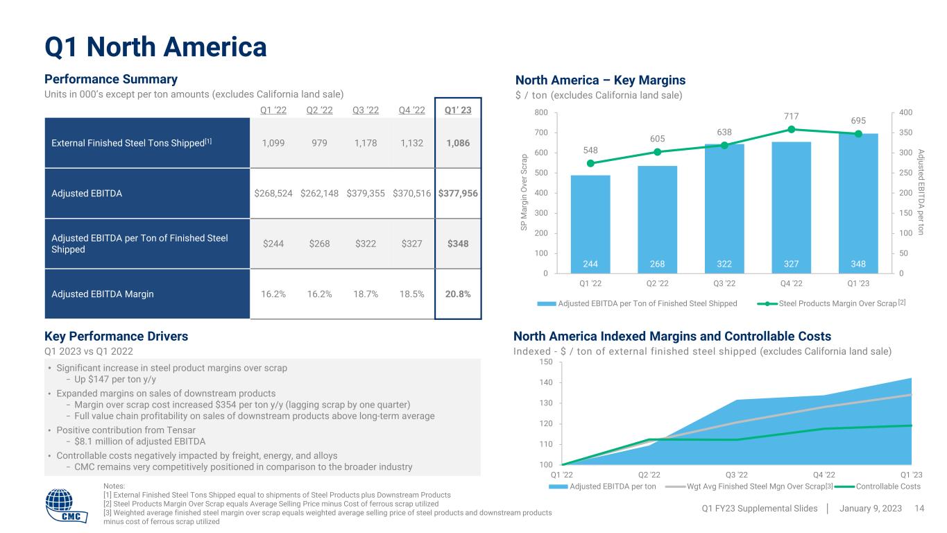 327 425 109 15 5 10 0 50 100 150 200 250 300 350 400 450 Q1 2022 NA Segment EBITDA Europe Segment EBITDA Corp & Eliminations Other Non-Op Items Q1 2023 Q1 Consolidated Operating Results Q1 FY23 Supplemental Slides │ January 9, 2023 13 Q1 ‘22 Q2 ‘22 Q3 ‘22 Q4 ’22 Q1 ’23 External Finished Steel Tons Shipped1 1,464 1,429 1,654 1,560 1,559 Core EBITDA2 $326,806 $323,107 $483,913 $419,021 $424,985 Core EBITDA per Ton of Finished Steel Shipped2 $223 $226 $293 $269 $273 Adjusted Earnings2 $199,152 $187,553 $320,244 $294,924 $266,192 Performance Summary Units in 000’s except per ton amounts • $5.6 million in costs related to start-up activities at Arizona 2 mill project Non-Operating Charges (excluded from results above) Figures are pre-tax for Q1 2023 [1] External Finished Steel Tons Shipped equal to shipments of Steel Products plus Downstream Products [2] Core EBITDA, Core EBITDA per ton of finished steel shipped, and adjusted earnings are non-GAAP measures. For reconciliations of non-GAAP financial measures to the most directly comparable GAAP financial measures, see the appendix to this document. Core EBITDA Bridge – Q1 2022 to Q1 2023 $ Millions