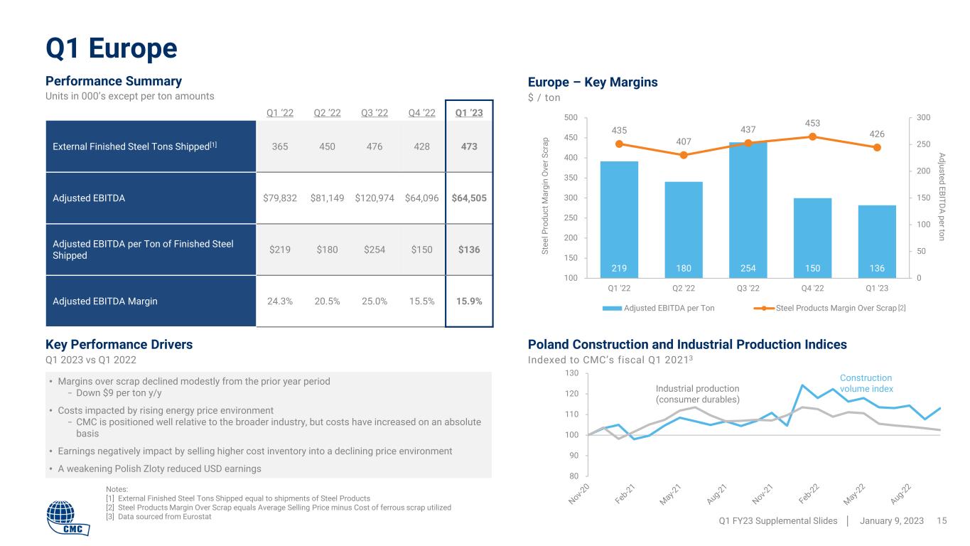 100 110 120 130 140 150 Q1 '22 Q2 '22 Q3 '22 Q4 '22 Q1 '23 Adjusted EBITDA per ton Wgt Avg Finished Steel Mgn Over Scrap Controllable Costs 244 268 322 327 348 548 605 638 717 695 0 50 100 150 200 250 300 350 400 0 100 200 300 400 500 600 700 800 Q1 '22 Q2 '22 Q3 '22 Q4 '22 Q1 '23 Adjusted EBITDA per Ton of Finished Steel Shipped Steel Products Margin Over Scrap Key Performance Drivers Q1 2023 vs Q1 2022 Q1 North America Q1 FY23 Supplemental Slides │ January 9, 2023 14 Q1 ‘22 Q2 ‘22 Q3 ’22 Q4 ’22 Q1’ 23 External Finished Steel Tons Shipped[1] 1,099 979 1,178 1,132 1,086 Adjusted EBITDA $268,524 $262,148 $379,355 $370,516 $377,956 Adjusted EBITDA per Ton of Finished Steel Shipped $244 $268 $322 $327 $348 Adjusted EBITDA Margin 16.2% 16.2% 18.7% 18.5% 20.8% Performance Summary Units in 000’s except per ton amounts (excludes California land sale) • Significant increase in steel product margins over scrap − Up $147 per ton y/y • Expanded margins on sales of downstream products − Margin over scrap cost increased $354 per ton y/y (lagging scrap by one quarter) − Full value chain profitability on sales of downstream products above long-term average • Positive contribution from Tensar − $8.1 million of adjusted EBITDA • Controllable costs negatively impacted by freight, energy, and alloys − CMC remains very competitively positioned in comparison to the broader industry Notes: [1] External Finished Steel Tons Shipped equal to shipments of Steel Products plus Downstream Products [2] Steel Products Margin Over Scrap equals Average Selling Price minus Cost of ferrous scrap utilized [3] Weighted average finished steel margin over scrap equals weighted average selling price of steel products and downstream products minus cost of ferrous scrap utilized North America – Key Margins $ / ton (excludes California land sale) SP M ar gi n O ve r S cr ap Adjusted EBITDA per ton North America Indexed Margins and Controllable Costs Indexed - $ / ton of external finished steel shipped (excludes California land sale) [2] [3]