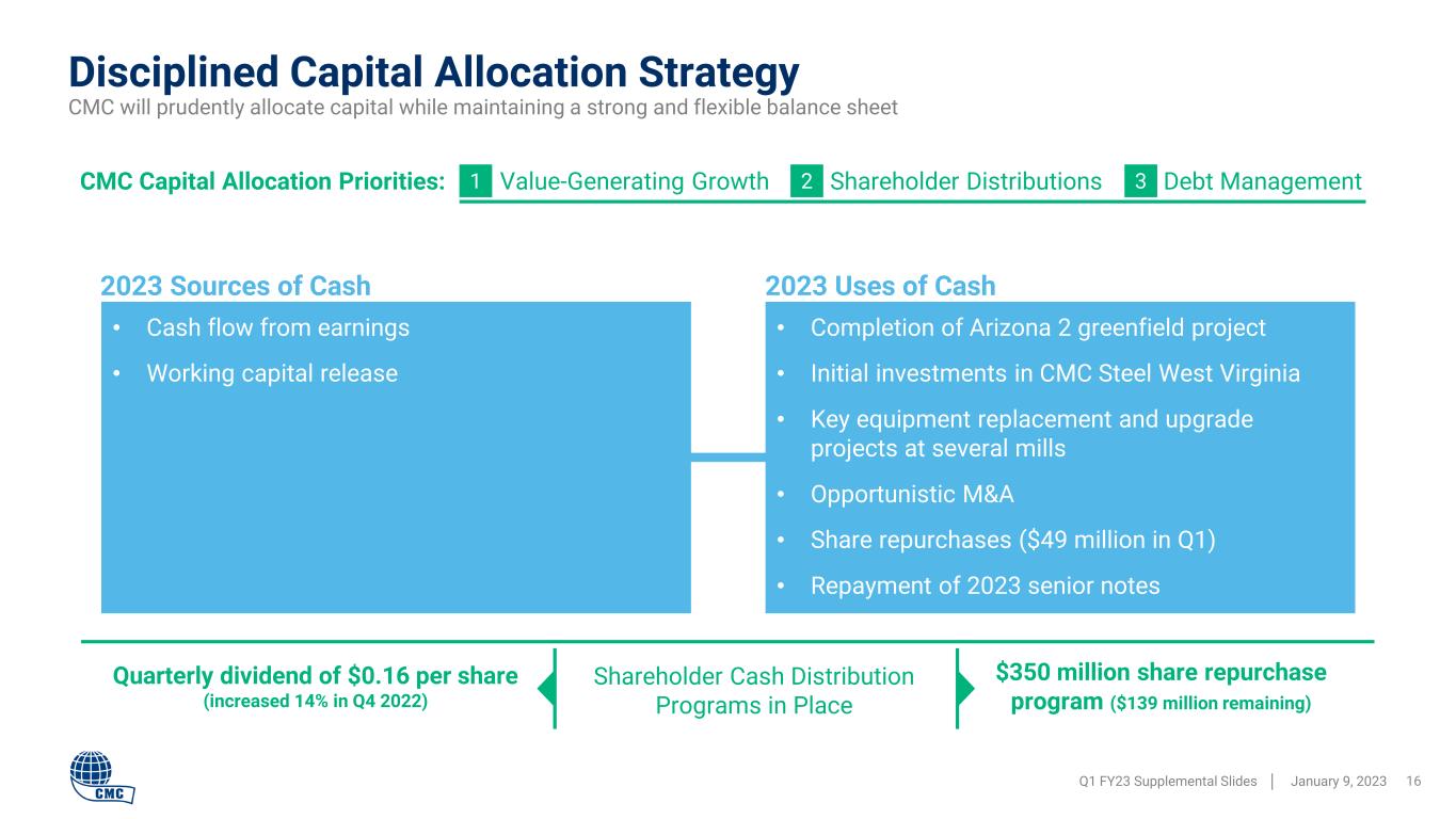 80 90 100 110 120 130 219 180 254 150 136 435 407 437 453 426 0 50 100 150 200 250 300 100 150 200 250 300 350 400 450 500 Q1 '22 Q2 '22 Q3 '22 Q4 '22 Q1 '23 Adjusted EBITDA per Ton Steel Products Margin Over Scrap Key Performance Drivers Q1 2023 vs Q1 2022 Q1 Europe Q1 FY23 Supplemental Slides │ January 9, 2023 15 Q1 ‘22 Q2 ’22 Q3 ’22 Q4 ’22 Q1 ’23 External Finished Steel Tons Shipped[1] 365 450 476 428 473 Adjusted EBITDA $79,832 $81,149 $120,974 $64,096 $64,505 Adjusted EBITDA per Ton of Finished Steel Shipped $219 $180 $254 $150 $136 Adjusted EBITDA Margin 24.3% 20.5% 25.0% 15.5% 15.9% Performance Summary Units in 000’s except per ton amounts • Margins over scrap declined modestly from the prior year period − Down $9 per ton y/y • Costs impacted by rising energy price environment − CMC is positioned well relative to the broader industry, but costs have increased on an absolute basis • Earnings negatively impact by selling higher cost inventory into a declining price environment • A weakening Polish Zloty reduced USD earnings Europe – Key Margins $ / ton Adjusted EBITDA per ton Poland Construction and Industrial Production Indices Indexed to CMC’s fiscal Q1 2021 [2] Notes: [1] External Finished Steel Tons Shipped equal to shipments of Steel Products [2] Steel Products Margin Over Scrap equals Average Selling Price minus Cost of ferrous scrap utilized [3] Data sourced from Eurostat St ee l P ro du ct M ar gi n O ve r S cr ap 3 Industrial production (consumer durables) Construction volume index