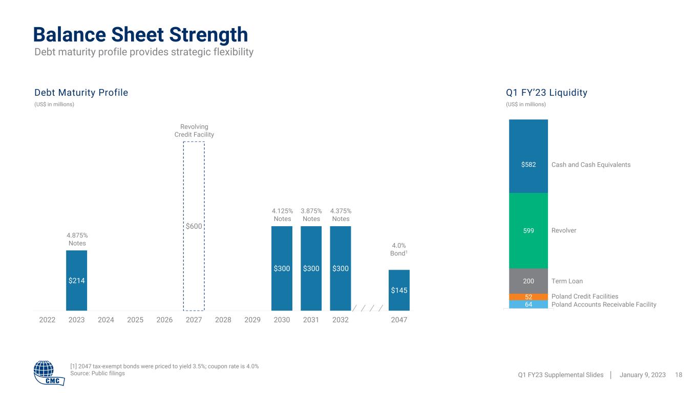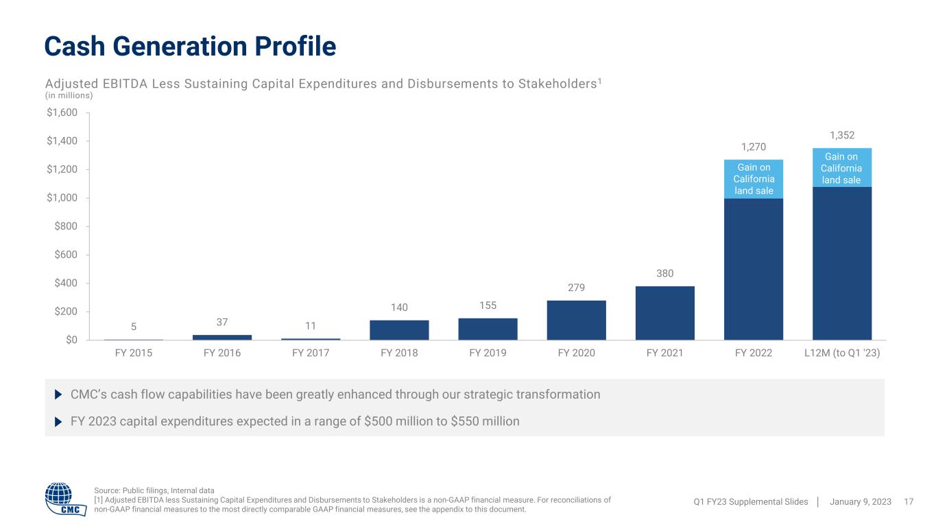5 37 11 140 155 279 380 1,270 1,352 $0 $200 $400 $600 $800 $1,000 $1,200 $1,400 $1,600 FY 2015 FY 2016 FY 2017 FY 2018 FY 2019 FY 2020 FY 2021 FY 2022 L12M (to Q1 '23) Cash Generation Profile Q1 FY23 Supplemental Slides │ January 9, 2023 17 Adjusted EBITDA Less Sustaining Capital Expenditures and Disbursements to Stakeholders1 (in millions) CMC’s cash flow capabilities have been greatly enhanced through our strategic transformation FY 2023 capital expenditures expected in a range of $500 million to $550 million Source: Public filings, Internal data [1] Adjusted EBITDA less Sustaining Capital Expenditures and Disbursements to Stakeholders is a non-GAAP financial measure. For reconciliations of non-GAAP financial measures to the most directly comparable GAAP financial measures, see the appendix to this document. Gain on California land sale Gain on California land sale