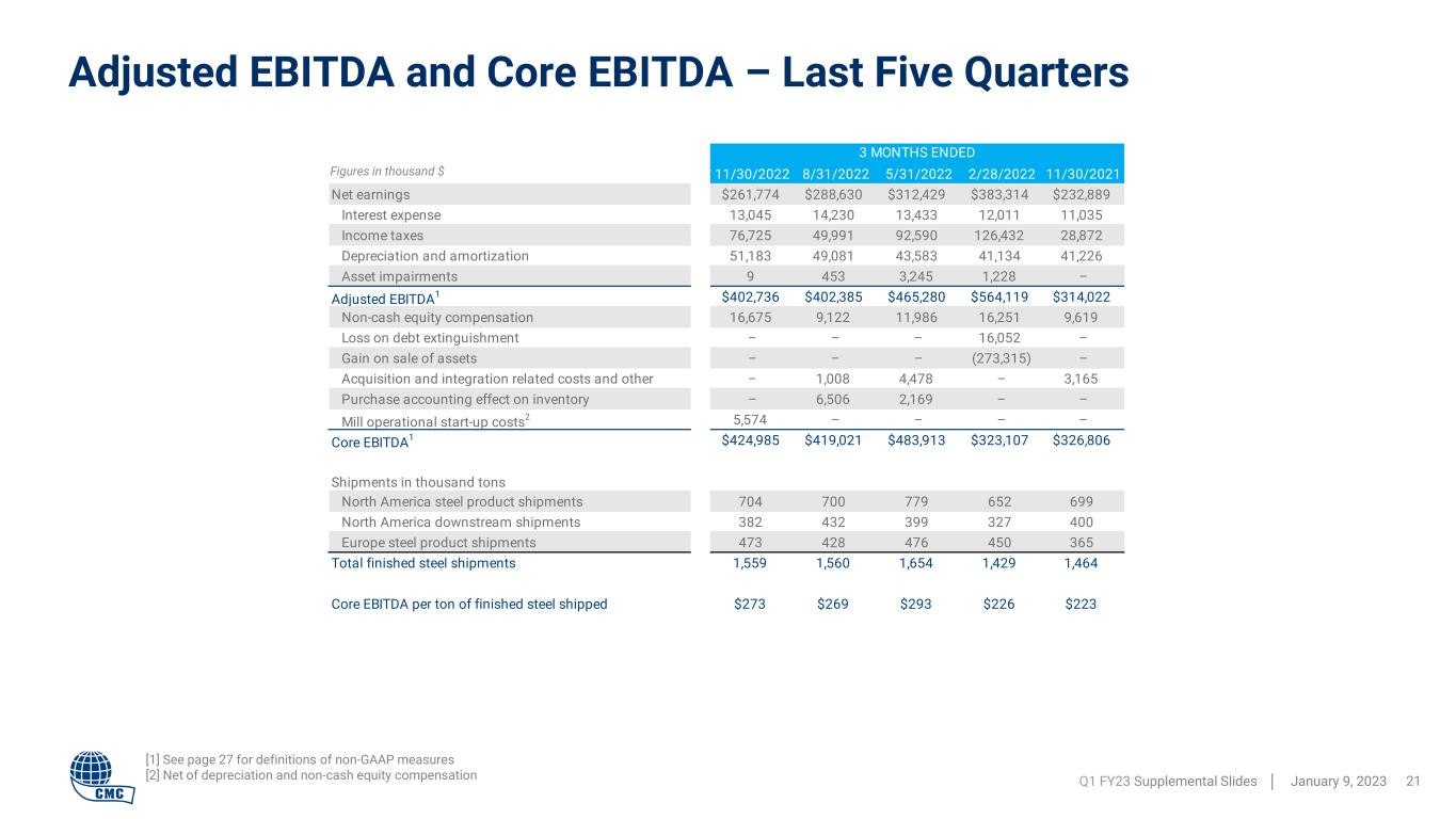 11/30/2022 8/31/2022 5/31/2022 2/28/2022 11/30/2021 Net earnings $261,774 $288,630 $312,429 $383,314 $232,889 Interest expense 13,045 14,230 13,433 12,011 11,035 Income taxes 76,725 49,991 92,590 126,432 28,872 Depreciation and amortization 51,183 49,081 43,583 41,134 41,226 Asset impairments 9 453 3,245 1,228 – Adjusted EBITDA1 $402,736 $402,385 $465,280 $564,119 $314,022 Non-cash equity compensation 16,675 9,122 11,986 16,251 9,619 Loss on debt extinguishment – – – 16,052 – Gain on sale of assets – – – (273,315) – Acquisition and integration related costs and other – 1,008 4,478 – 3,165 Purchase accounting effect on inventory – 6,506 2,169 – – Mill operational start-up costs2 5,574 – – – – Core EBITDA1 $424,985 $419,021 $483,913 $323,107 $326,806 Shipments in thousand tons North America steel product shipments 704 700 779 652 699 North America downstream shipments 382 432 399 327 400 Europe steel product shipments 473 428 476 450 365 Total finished steel shipments 1,559 1,560 1,654 1,429 1,464 Core EBITDA per ton of finished steel shipped $273 $269 $293 $226 $223 3 MONTHS ENDED Adjusted EBITDA and Core EBITDA – Last Five Quarters Q1 FY23 Supplemental Slides │ January 9, 2023 21 [1] See page 27 for definitions of non-GAAP measures [2] Net of depreciation and non-cash equity compensation Figures in thousand $