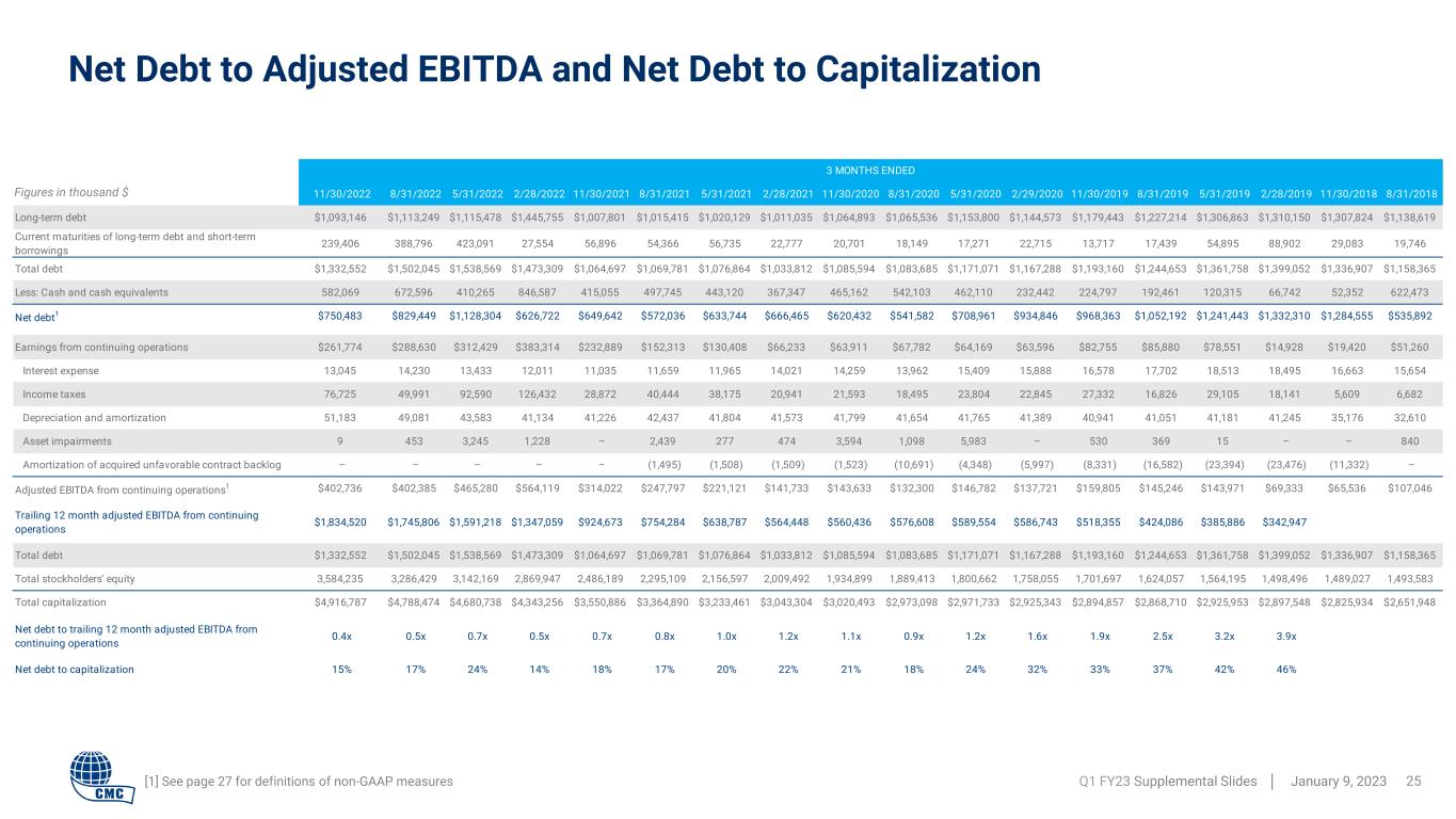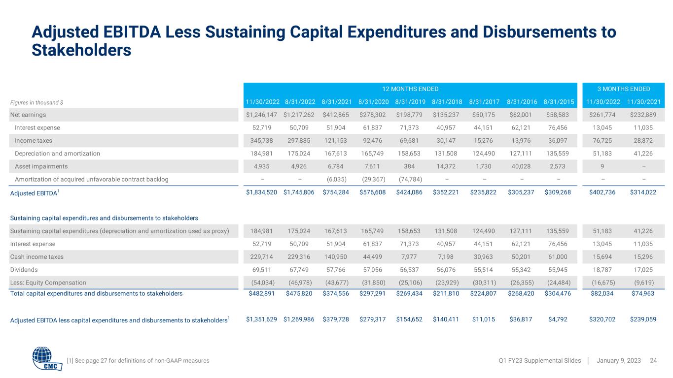11/30/2022 8/31/2022 8/31/2021 8/31/2020 8/31/2019 8/31/2018 8/31/2017 8/31/2016 8/31/2015 11/30/2022 11/30/2021 Net earnings $1,246,147 $1,217,262 $412,865 $278,302 $198,779 $135,237 $50,175 $62,001 $58,583 $261,774 $232,889 Interest expense 52,719 50,709 51,904 61,837 71,373 40,957 44,151 62,121 76,456 13,045 11,035 Income taxes 345,738 297,885 121,153 92,476 69,681 30,147 15,276 13,976 36,097 76,725 28,872 Depreciation and amortization 184,981 175,024 167,613 165,749 158,653 131,508 124,490 127,111 135,559 51,183 41,226 Asset impairments 4,935 4,926 6,784 7,611 384 14,372 1,730 40,028 2,573 9 – Amortization of acquired unfavorable contract backlog – – (6,035) (29,367) (74,784) – – – – – – Adjusted EBITDA1 $1,834,520 $1,745,806 $754,284 $576,608 $424,086 $352,221 $235,822 $305,237 $309,268 $402,736 $314,022 Sustaining capital expenditures and disbursements to stakeholders Sustaining capital expenditures (depreciation and amortization used as proxy) 184,981 175,024 167,613 165,749 158,653 131,508 124,490 127,111 135,559 51,183 41,226 Interest expense 52,719 50,709 51,904 61,837 71,373 40,957 44,151 62,121 76,456 13,045 11,035 Cash income taxes 229,714 229,316 140,950 44,499 7,977 7,198 30,963 50,201 61,000 15,694 15,296 Dividends 69,511 67,749 57,766 57,056 56,537 56,076 55,514 55,342 55,945 18,787 17,025 Less: Equity Compensation (54,034) (46,978) (43,677) (31,850) (25,106) (23,929) (30,311) (26,355) (24,484) (16,675) (9,619) Total capital expenditures and disbursements to stakeholders $482,891 $475,820 $374,556 $297,291 $269,434 $211,810 $224,807 $268,420 $304,476 $82,034 $74,963 Adjusted EBITDA less capital expenditures and disbursements to stakeholders1 $1,351,629 $1,269,986 $379,728 $279,317 $154,652 $140,411 $11,015 $36,817 $4,792 $320,702 $239,059 12 MONTHS ENDED 3 MONTHS ENDED [1] See page 27 for definitions of non-GAAP measures Adjusted EBITDA Less Sustaining Capital Expenditures and Disbursements to Stakeholders Q1 FY23 Supplemental Slides │ January 9, 2023 24 Figures in thousand $