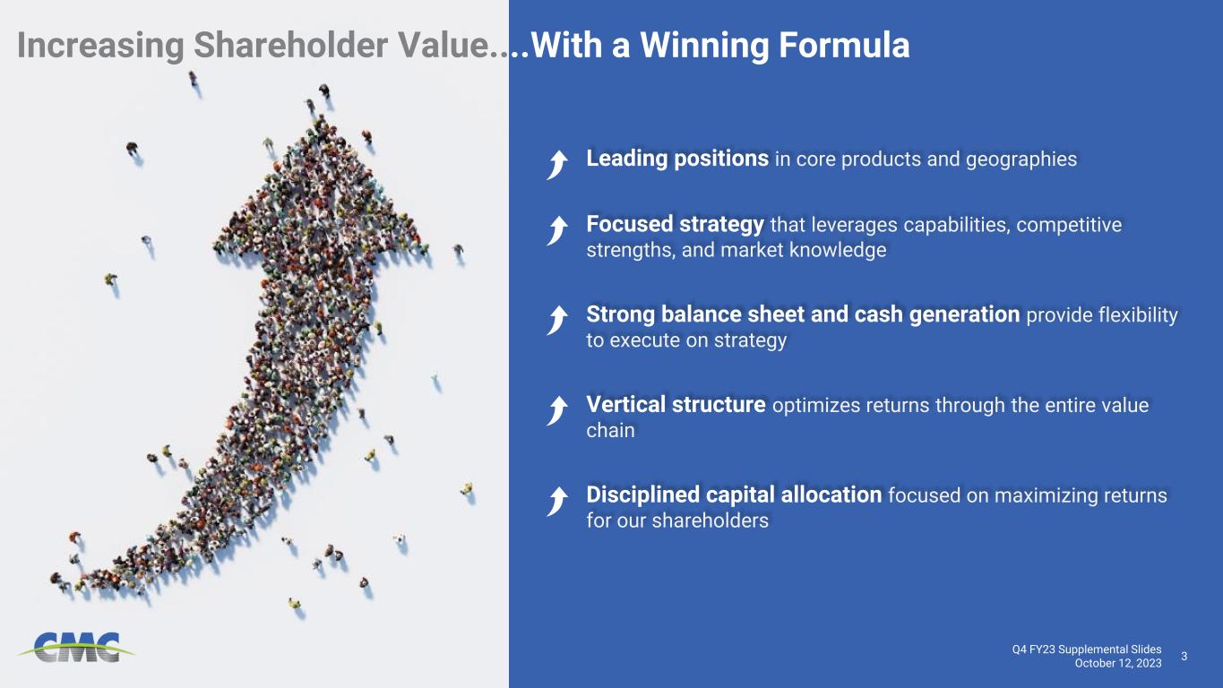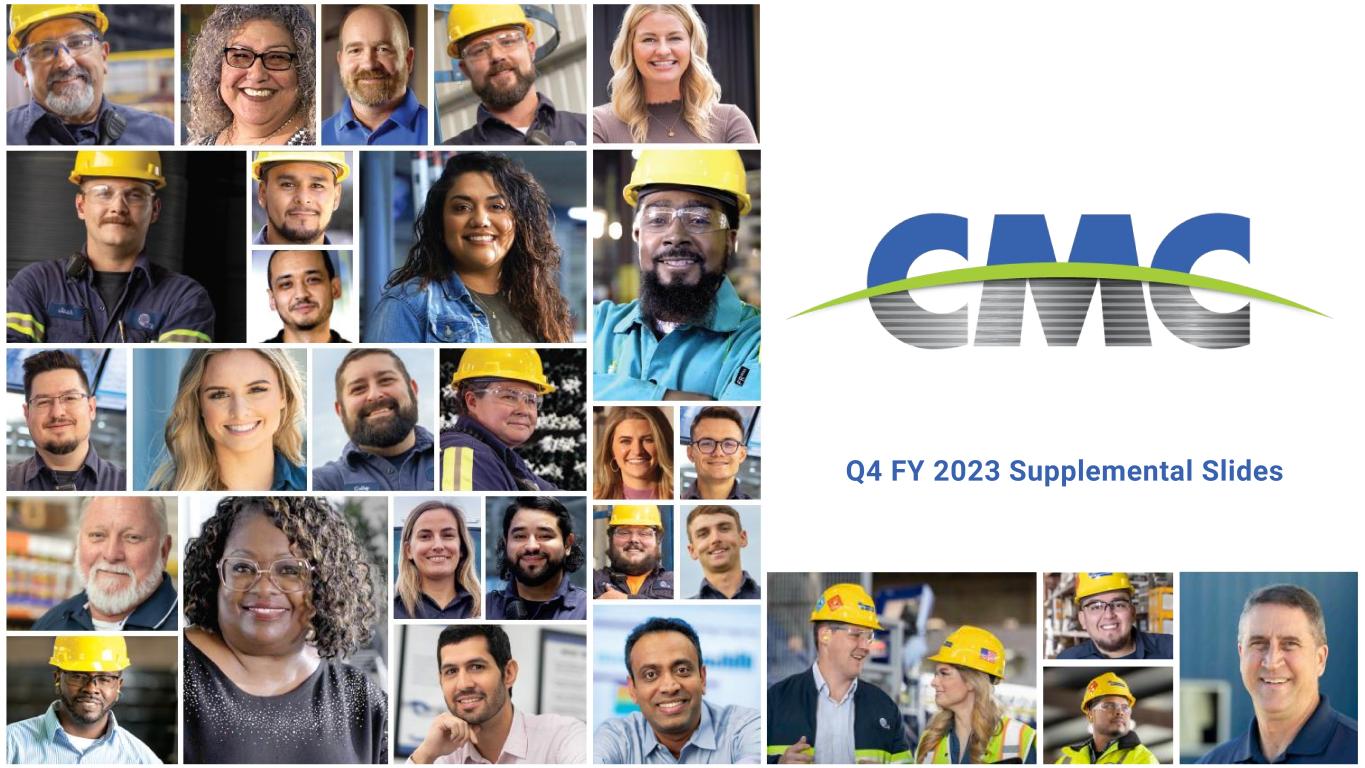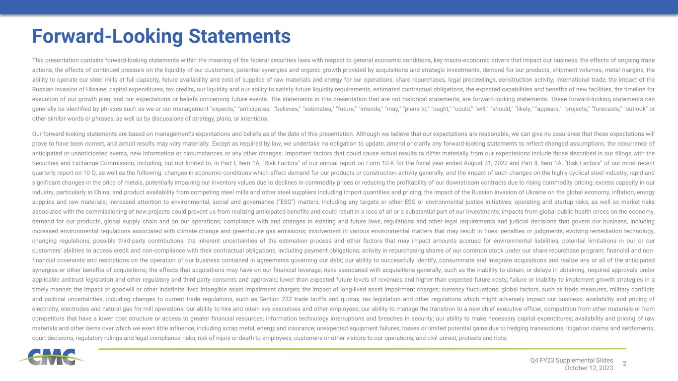 2Q4 FY23 Supplemental Slides October 12, 2023 This presentation contains forward-looking statements within the meaning of the federal securities laws with respect to general economic conditions, key macro-economic drivers that impact our business, the effects of ongoing trade actions, the effects of continued pressure on the liquidity of our customers, potential synergies and organic growth provided by acquisitions and strategic investments, demand for our products, shipment volumes, metal margins, the ability to operate our steel mills at full capacity, future availability and cost of supplies of raw materials and energy for our operations, share repurchases, legal proceedings, construction activity, international trade, the impact of the Russian invasion of Ukraine, capital expenditures, tax credits, our liquidity and our ability to satisfy future liquidity requirements, estimated contractual obligations, the expected capabilities and benefits of new facilities, the timeline for execution of our growth plan, and our expectations or beliefs concerning future events. The statements in this presentation that are not historical statements, are forward-looking statements. These forward-looking statements can generally be identified by phrases such as we or our management "expects," "anticipates," "believes," "estimates," "future," "intends," "may," "plans to," "ought," "could," "will," "should," "likely," "appears," "projects," "forecasts," "outlook" or other similar words or phrases, as well as by discussions of strategy, plans, or intentions. Our forward-looking statements are based on management’s expectations and beliefs as of the date of this presentation. Although we believe that our expectations are reasonable, we can give no assurance that these expectations will prove to have been correct, and actual results may vary materially. Except as required by law, we undertake no obligation to update, amend or clarify any forward-looking statements to reflect changed assumptions, the occurrence of anticipated or unanticipated events, new information or circumstances or any other changes. Important factors that could cause actual results to differ materially from our expectations include those described in our filings with the Securities and Exchange Commission, including, but not limited to, in Part I, Item 1A, "Risk Factors" of our annual report on Form 10-K for the fiscal year ended August 31, 2022 and Part II, Item 1A, “Risk Factors” of our most recent quarterly report on 10-Q, as well as the following: changes in economic conditions which affect demand for our products or construction activity generally, and the impact of such changes on the highly cyclical steel industry; rapid and significant changes in the price of metals, potentially impairing our inventory values due to declines in commodity prices or reducing the profitability of our downstream contracts due to rising commodity pricing; excess capacity in our industry, particularly in China, and product availability from competing steel mills and other steel suppliers including import quantities and pricing; the impact of the Russian invasion of Ukraine on the global economy, inflation, energy supplies and raw materials; increased attention to environmental, social and governance (“ESG”) matters, including any targets or other ESG or environmental justice initiatives; operating and startup risks, as well as market risks associated with the commissioning of new projects could prevent us from realizing anticipated benefits and could result in a loss of all or a substantial part of our investments; impacts from global public health crises on the economy, demand for our products, global supply chain and on our operations; compliance with and changes in existing and future laws, regulations and other legal requirements and judicial decisions that govern our business, including increased environmental regulations associated with climate change and greenhouse gas emissions; involvement in various environmental matters that may result in fines, penalties or judgments; evolving remediation technology, changing regulations, possible third-party contributions, the inherent uncertainties of the estimation process and other factors that may impact amounts accrued for environmental liabilities; potential limitations in our or our customers' abilities to access credit and non-compliance with their contractual obligations, including payment obligations; activity in repurchasing shares of our common stock under our share repurchase program; financial and non- financial covenants and restrictions on the operation of our business contained in agreements governing our debt; our ability to successfully identify, consummate and integrate acquisitions and realize any or all of the anticipated synergies or other benefits of acquisitions; the effects that acquisitions may have on our financial leverage; risks associated with acquisitions generally, such as the inability to obtain, or delays in obtaining, required approvals under applicable antitrust legislation and other regulatory and third party consents and approvals; lower than expected future levels of revenues and higher than expected future costs; failure or inability to implement growth strategies in a timely manner; the impact of goodwill or other indefinite lived intangible asset impairment charges; the impact of long-lived asset impairment charges; currency fluctuations; global factors, such as trade measures, military conflicts and political uncertainties, including changes to current trade regulations, such as Section 232 trade tariffs and quotas, tax legislation and other regulations which might adversely impact our business; availability and pricing of electricity, electrodes and natural gas for mill operations; our ability to hire and retain key executives and other employees; our ability to manage the transition to a new chief executive officer; competition from other materials 