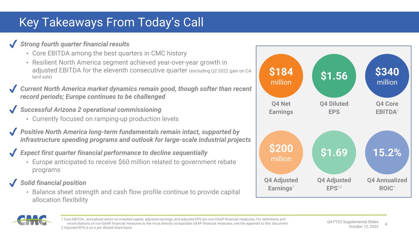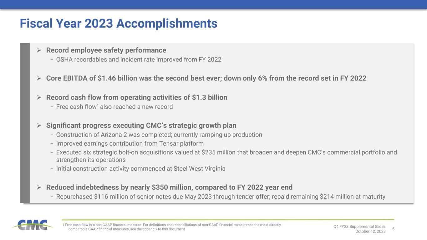 4 Key Takeaways From Today’s Call Strong fourth quarter financial results • Core EBITDA among the best quarters in CMC history • Resilient North America segment achieved year-over-year growth in adjusted EBITDA for the eleventh consecutive quarter (excluding Q2 2022 gain on CA land sale) Current North America market dynamics remain good, though softer than recent record periods; Europe continues to be challenged Successful Arizona 2 operational commissioning • Currently focused on ramping-up production levels Positive North America long-term fundamentals remain intact, supported by infrastructure spending programs and outlook for large-scale industrial projects Expect first quarter financial performance to decline sequentially • Europe anticipated to receive $60 million related to government rebate programs Solid financial position • Balance sheet strength and cash flow profile continue to provide capital allocation flexibility Q4 FY23 Supplemental Slides October 12, 2023 $1.56 Q4 Diluted EPS 1 Core EBITDA , annualized return on invested capital, adjusted earnings, and adjusted EPS are non-GAAP financial measures. For definitions and reconciliations of non-GAAP financial measures to the most directly comparable GAAP financial measures, see the appendix to this document 2 Adjusted EPS is on a per diluted share basis $340 million $1.69 15.2% Q4 Core EBITDA1 Q4 Adjusted EPS1,2 Q4 Annualized ROIC1 ✔ ✔ ✔ ✔ ✔ ✔ $184 million Q4 Net Earnings $200 million Q4 Adjusted Earnings1