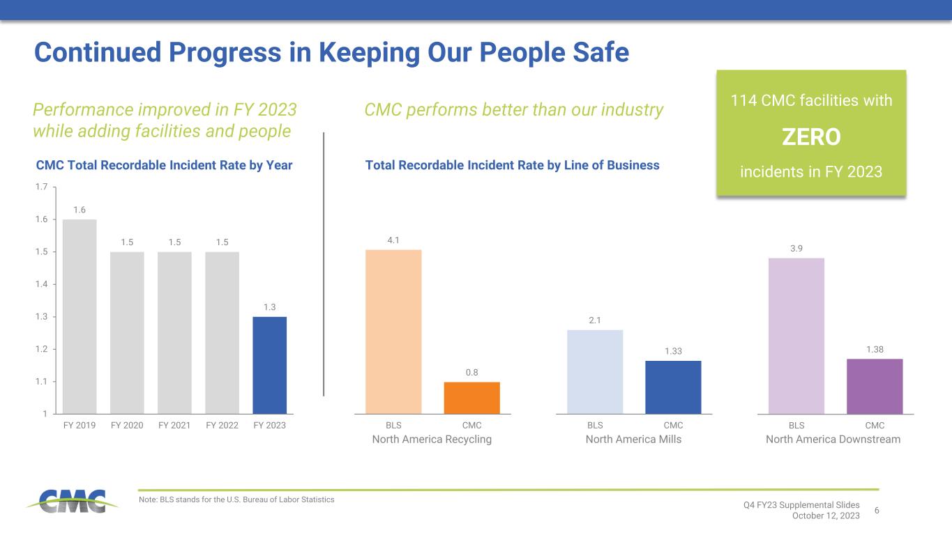 5 ➢ Record employee safety performance − OSHA recordables and incident rate improved from FY 2022 ➢ Core EBITDA of $1.46 billion was the second best ever; down only 6% from the record set in FY 2022 ➢ Record cash flow from operating activities of $1.3 billion − Free cash flow1 also reached a new record ➢ Significant progress executing CMC’s strategic growth plan − Construction of Arizona 2 was completed; currently ramping up production − Improved earnings contribution from Tensar platform − Executed six strategic bolt-on acquisitions valued at $235 million that broaden and deepen CMC’s commercial portfolio and strengthen its operations − Initial construction activity commenced at Steel West Virginia ➢ Reduced indebtedness by nearly $350 million, compared to FY 2022 year end − Repurchased $116 million of senior notes due May 2023 through tender offer; repaid remaining $214 million at maturity Fiscal Year 2023 Accomplishments 1 Free cash flow is a non-GAAP financial measure. For definitions and reconciliations of non-GAAP financial measures to the most directly comparable GAAP financial measures, see the appendix to this document Q4 FY23 Supplemental Slides October 12, 2023
