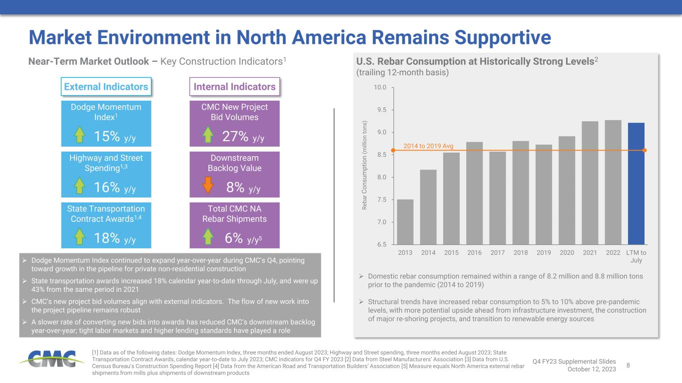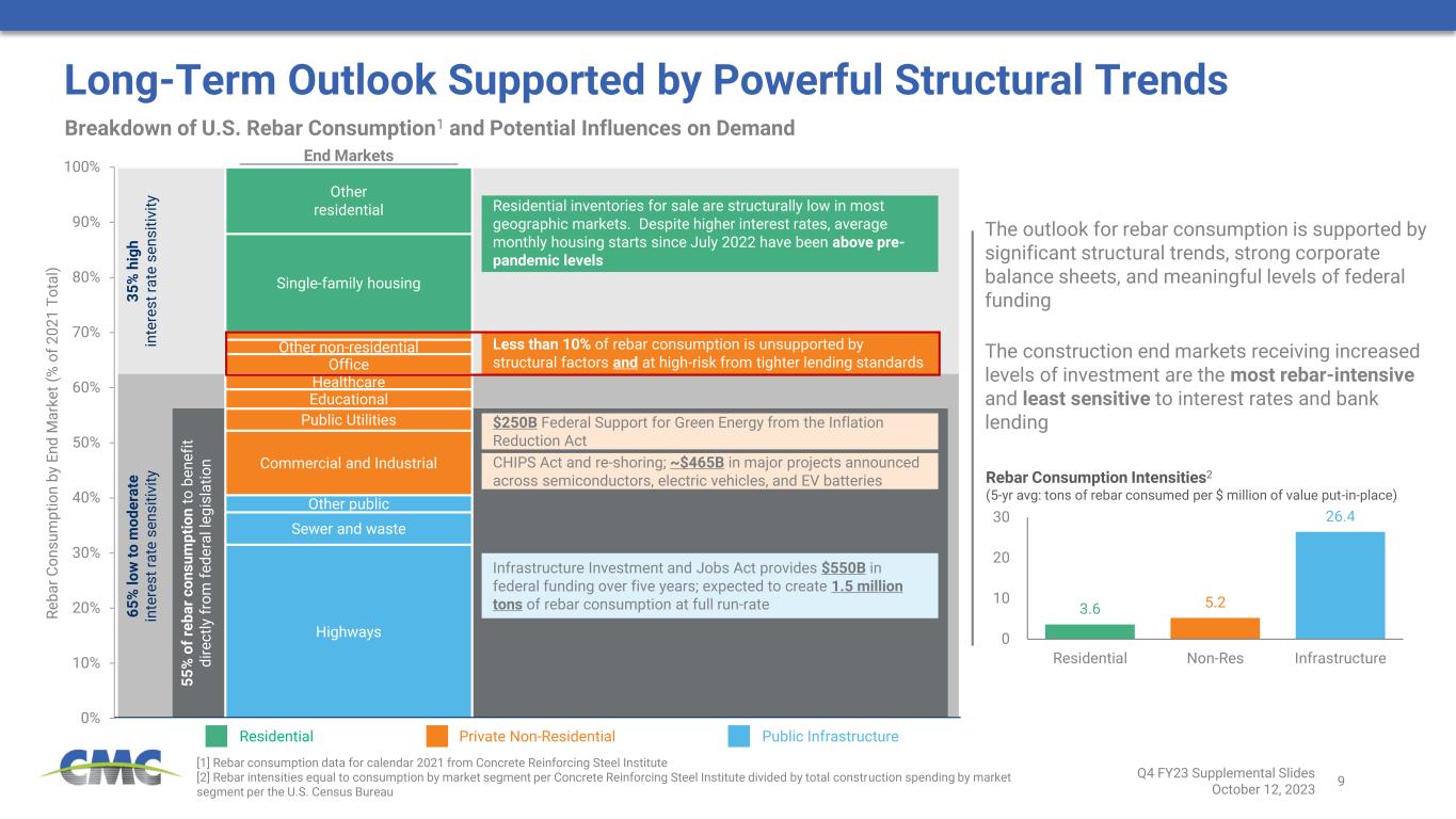 8 6.5 7.0 7.5 8.0 8.5 9.0 9.5 10.0 2013 2014 2015 2016 2017 2018 2019 2020 2021 2022 LTM to July Market Environment in North America Remains Supportive ➢ Dodge Momentum Index continued to expand year-over-year during CMC’s Q4, pointing toward growth in the pipeline for private non-residential construction ➢ State transportation awards increased 18% calendar year-to-date through July, and were up 43% from the same period in 2021 ➢ CMC’s new project bid volumes align with external indicators. The flow of new work into the project pipeline remains robust ➢ A slower rate of converting new bids into awards has reduced CMC’s downstream backlog year-over-year; tight labor markets and higher lending standards have played a role [1] Data as of the following dates: Dodge Momentum Index, three months ended August 2023; Highway and Street spending, three months ended August 2023; State Transportation Contract Awards, calendar year-to-date to July 2023; CMC indicators for Q4 FY 2023 [2] Data from Steel Manufacturers’ Association [3] Data from U.S. Census Bureau’s Construction Spending Report [4] Data from the American Road and Transportation Builders’ Association [5] Measure equals North America external rebar shipments from mills plus shipments of downstream products Dodge Momentum Index1 15% y/y Highway and Street Spending1,3 16% y/y CMC New Project Bid Volumes 27% y/y Downstream Backlog Value 8% y/y Near-Term Market Outlook – Key Construction Indicators1 External Indicators Internal Indicators R e b a r C o n s u m p ti o n ( m ill io n t o n s ) U.S. Rebar Consumption at Historically Strong Levels2 (trailing 12-month basis) State Transportation Contract Awards1,4 18% y/y Total CMC NA Rebar Shipments 6% y/y5 2014 to 2019 Avg ➢ Domestic rebar consumption remained within a range of 8.2 million and 8.8 million tons prior to the pandemic (2014 to 2019) ➢ Structural trends have increased rebar consumption to 5% to 10% above pre-pandemic levels, with more potential upside ahead from infrastructure investment, the construction of major re-shoring projects, and transition to renewable energy sources Q4 FY23 Supplemental Slides October 12, 2023