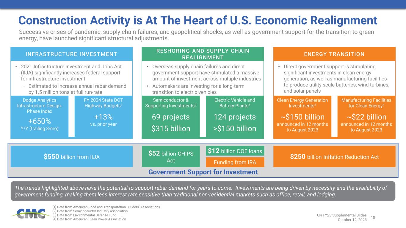 9 Long-Term Outlook Supported by Powerful Structural Trends [1] Rebar consumption data for calendar 2021 from Concrete Reinforcing Steel Institute [2] Rebar intensities equal to consumption by market segment per Concrete Reinforcing Steel Institute divided by total construction spending by market segment per the U.S. Census Bureau Breakdown of U.S. Rebar Consumption1 and Potential Influences on Demand The outlook for rebar consumption is supported by significant structural trends, strong corporate balance sheets, and meaningful levels of federal funding The construction end markets receiving increased levels of investment are the most rebar-intensive and least sensitive to interest rates and bank lending 3.6 5.2 26.4 0 10 20 30 Residential Non-Res Infrastructure Rebar Consumption Intensities2 (5-yr avg: tons of rebar consumed per $ million of value put-in-place) 3 5 % h ig h in te re s t ra te s e n s it iv it y 6 5 % l o w t o m o d e ra te in te re s t ra te s e n s it iv it y 5 5 % o f re b a r c o n s u m p ti o n t o b e n e fi t d ir e c tl y fr o m f e d e ra l l e g is la ti o n Highways Sewer and waste Other public Commercial and Industrial Public Utilities Educational Healthcare Office Other non-residential Single-family housing Other residential 0% 10% 20% 30% 40% 50% 60% 70% 80% 90% 100% $250B Federal Support for Green Energy from the Inflation Reduction Act CHIPS Act and re-shoring; ~$465B in major projects announced across semiconductors, electric vehicles, and EV batteries Infrastructure Investment and Jobs Act provides $550B in federal funding over five years; expected to create 1.5 million tons of rebar consumption at full run-rate Residential inventories for sale are structurally low in most geographic markets. Despite higher interest rates, average monthly housing starts since July 2022 have been above pre- pandemic levels Less than 10% of rebar consumption is unsupported by structural factors and at high-risk from tighter lending standards R e b a r C o n s u m p ti o n b y E n d M a rk e t (% o f 2 0 2 1 T o ta l) End Markets Residential Private Non-Residential Public Infrastructure Q4 FY23 Supplemental Slides October 12, 2023