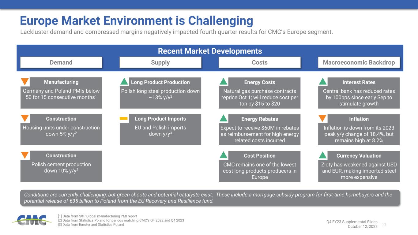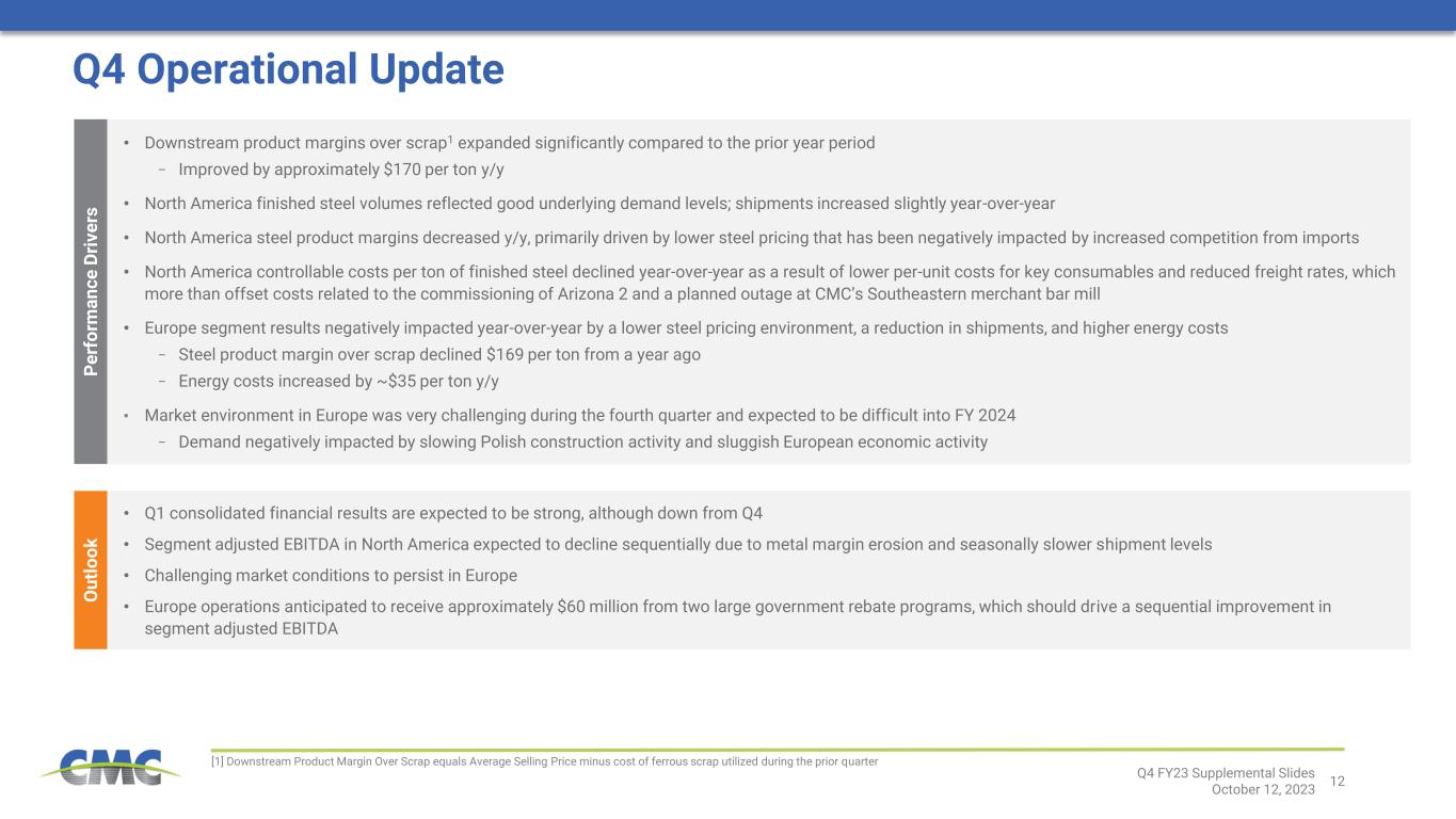 11 Recent Market Developments Europe Market Environment is Challenging [1] Data from S&P Global manufacturing PMI report [2] Data from Statistics Poland for periods matching CMC’s Q4 2022 and Q4 2023 [3] Data from Eurofer and Statistics Poland Conditions are currently challenging, but green shoots and potential catalysts exist. These include a mortgage subsidy program for first-time homebuyers and the potential release of €35 billion to Poland from the EU Recovery and Resilience fund. Lackluster demand and compressed margins negatively impacted fourth quarter results for CMC’s Europe segment. Demand Supply Costs Macroeconomic Backdrop Manufacturing Germany and Poland PMIs below 50 for 15 consecutive months1 Energy Costs Natural gas purchase contracts reprice Oct 1; will reduce cost per ton by $15 to $20 Long Product Imports EU and Polish imports down y/y3 Construction Housing units under construction down 5% y/y2 Construction Polish cement production down 10% y/y2 Long Product Production Polish long steel production down ~13% y/y2 Energy Rebates Expect to receive $60M in rebates as reimbursement for high energy related costs incurred Interest Rates Central bank has reduced rates by 100bps since early Sep to stimulate growth Cost Position CMC remains one of the lowest cost long products producers in Europe Inflation Inflation is down from its 2023 peak y/y change of 18.4%, but remains high at 8.2% Currency Valuation Zloty has weakened against USD and EUR, making imported steel more expensive Q4 FY23 Supplemental Slides October 12, 2023