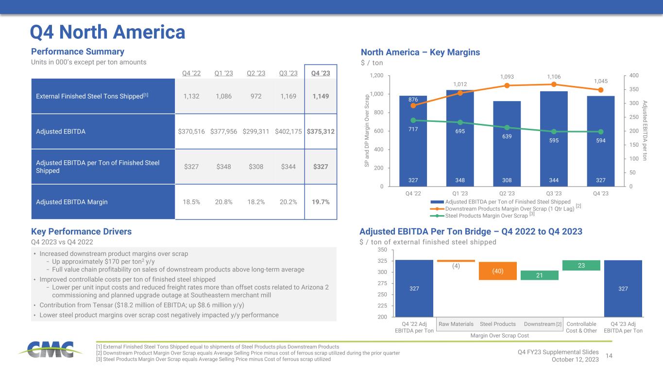 13 419 340 5 (90) (6) 12 0 50 100 150 200 250 300 350 400 450 500 550 Q4 Consolidated Operating Results Q4 ’22 Q1 ’23 Q2 ’23 Q3 ’23 Q4 ’23 External Finished Steel Tons Shipped1 1,560 1,559 1,408 1,598 1,538 Core EBITDA2 $419,021 $424,985 $302,788 $391,718 $340,029 Core EBITDA per Ton of Finished Steel Shipped2 $269 $273 $215 $245 $221 Adjusted Earnings2 $294,924 $266,192 $171,319 $239,729 $199,859 Performance Summary Units in 000’s except per ton amounts • $16.1 million in costs related to commissioning activities at Arizona 2 mill project • $3.7 million impairment charge related to a downstream location Non-Operating Adjustments Figures are pre-tax for Q4 2023 [1] External Finished Steel Tons Shipped equal to shipments of Steel Products plus Downstream Products [2] Core EBITDA, Core EBITDA per ton of finished steel shipped, and adjusted earnings are non-GAAP measures. For reconciliations of non-GAAP financial measures to the most directly comparable GAAP financial measures, see the appendix to this document. Core EBITDA Bridge – Q4 2022 to Q4 2023 $ Millions Q4 FY23 Supplemental Slides October 12, 2023