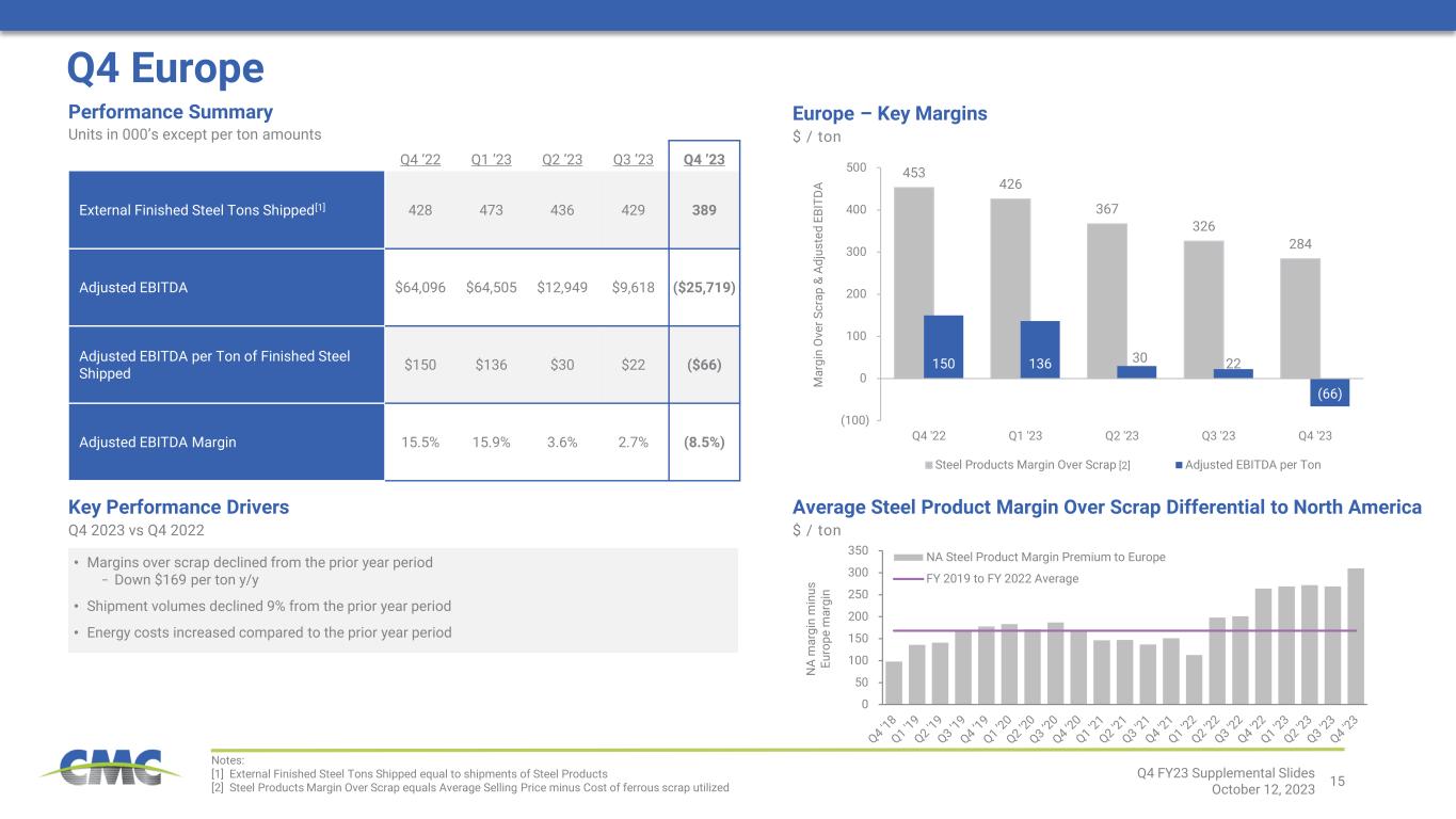 14 327 327 (4) (40) 21 23 200 225 250 275 300 325 350 Q4 '22 Adj EBITDA per Ton Raw Materials Steel Products Downstream Controllable Cost & Other Q4 '23 Adj EBITDA per Ton 327 348 308 344 327 876 1,012 1,093 1,106 1,045 717 695 639 595 594 0 50 100 150 200 250 300 350 400 0 200 400 600 800 1,000 1,200 Q4 '22 Q1 '23 Q2 '23 Q3 '23 Q4 '23 Adjusted EBITDA per Ton of Finished Steel Shipped Downstream Products Margin Over Scrap (1 Qtr Lag) Steel Products Margin Over Scrap Key Performance Drivers Q4 2023 vs Q4 2022 Q4 North America Q4 ’22 Q1 ‘23 Q2 ‘23 Q3 ’23 Q4 ’23 External Finished Steel Tons Shipped[1] 1,132 1,086 972 1,169 1,149 Adjusted EBITDA $370,516 $377,956 $299,311 $402,175 $375,312 Adjusted EBITDA per Ton of Finished Steel Shipped $327 $348 $308 $344 $327 Adjusted EBITDA Margin 18.5% 20.8% 18.2% 20.2% 19.7% Performance Summary Units in 000’s except per ton amounts • Increased downstream product margins over scrap − Up approximately $170 per ton2 y/y − Full value chain profitability on sales of downstream products above long-term average • Improved controllable costs per ton of finished steel shipped − Lower per unit input costs and reduced freight rates more than offset costs related to Arizona 2 commissioning and planned upgrade outage at Southeastern merchant mill • Contribution from Tensar ($18.2 million of EBITDA; up $8.6 million y/y) • Lower steel product margins over scrap cost negatively impacted y/y performance [1] External Finished Steel Tons Shipped equal to shipments of Steel Products plus Downstream Products [2] Downstream Product Margin Over Scrap equals Average Selling Price minus cost of ferrous scrap utilized during the prior quarter [3] Steel Products Margin Over Scrap equals Average Selling Price minus Cost of ferrous scrap utilized North America – Key Margins $ / ton S P a n d D P M a rg in O ve r S c ra p A d ju s te d E B IT D A p e r to n Adjusted EBITDA Per Ton Bridge – Q4 2022 to Q4 2023 $ / ton of external finished steel shipped [2] [3] [2] Margin Over Scrap Cost Q4 FY23 Supplemental Slides October 12, 2023