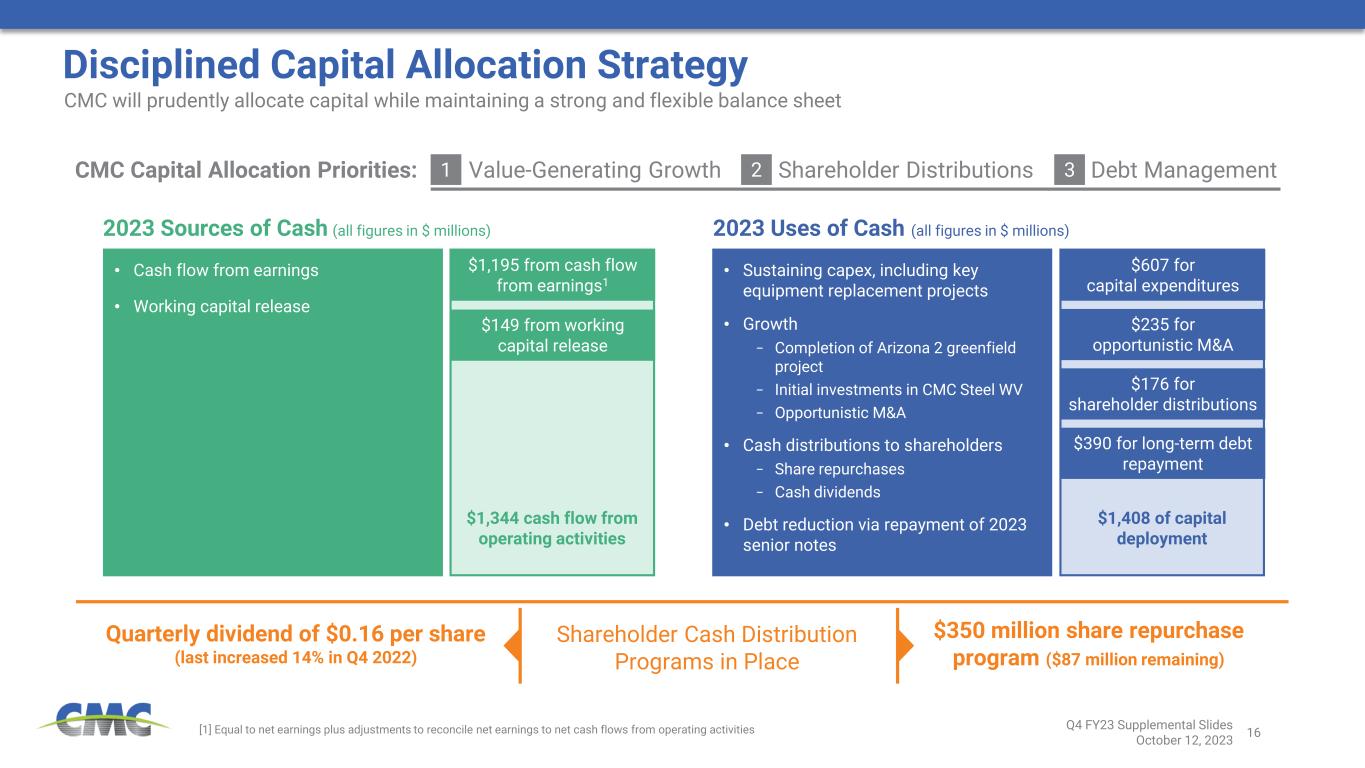 15 0 50 100 150 200 250 300 350 NA Steel Product Margin Premium to Europe FY 2019 to FY 2022 Average 453 426 367 326 284 150 136 30 22 (66) (100) 0 100 200 300 400 500 Q4 '22 Q1 '23 Q2 '23 Q3 '23 Q4 '23 Steel Products Margin Over Scrap Adjusted EBITDA per Ton Key Performance Drivers Q4 2023 vs Q4 2022 Q4 Europe Q4 ’22 Q1 ’23 Q2 ’23 Q3 ’23 Q4 ’23 External Finished Steel Tons Shipped[1] 428 473 436 429 389 Adjusted EBITDA $64,096 $64,505 $12,949 $9,618 ($25,719) Adjusted EBITDA per Ton of Finished Steel Shipped $150 $136 $30 $22 ($66) Adjusted EBITDA Margin 15.5% 15.9% 3.6% 2.7% (8.5%) Performance Summary Units in 000’s except per ton amounts • Margins over scrap declined from the prior year period − Down $169 per ton y/y • Shipment volumes declined 9% from the prior year period • Energy costs increased compared to the prior year period Europe – Key Margins $ / ton Average Steel Product Margin Over Scrap Differential to North America $ / ton [2] Notes: [1] External Finished Steel Tons Shipped equal to shipments of Steel Products [2] Steel Products Margin Over Scrap equals Average Selling Price minus Cost of ferrous scrap utilized M a rg in O ve r S c ra p & A d ju s te d E B IT D A N A m a rg in m in u s E u ro p e m a rg in Q4 FY23 Supplemental Slides October 12, 2023