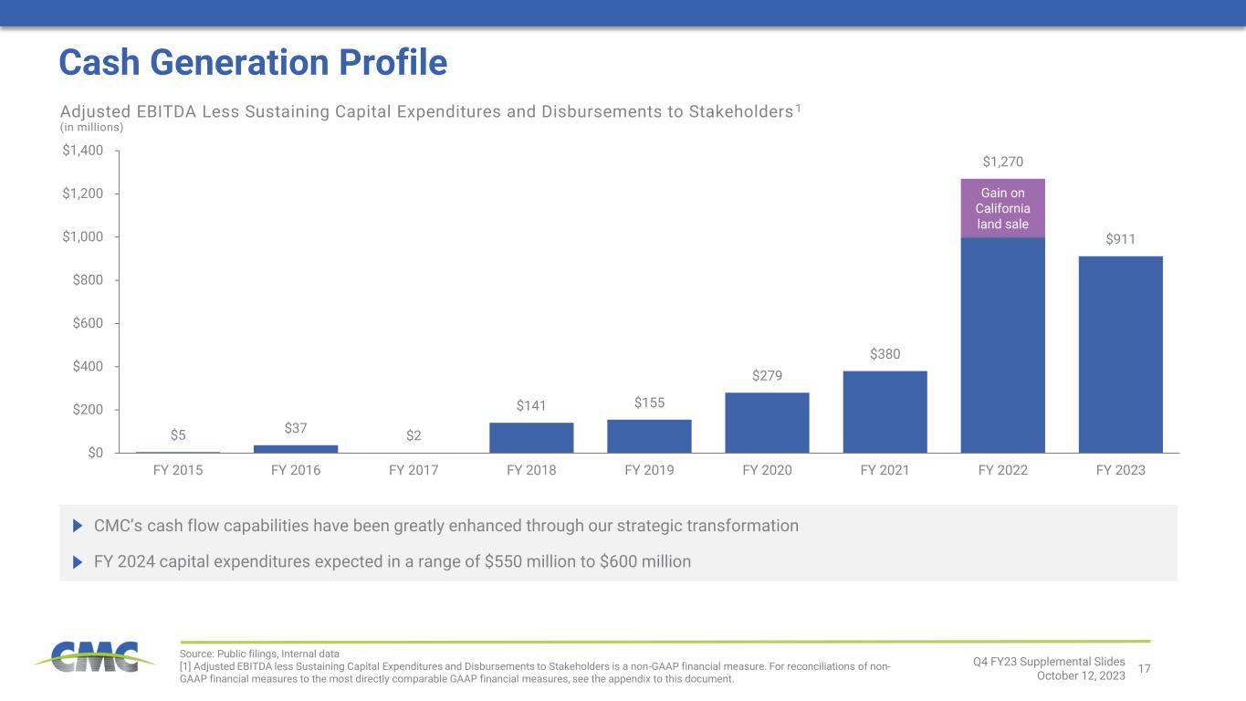 16 2 31 Disciplined Capital Allocation Strategy CMC Capital Allocation Priorities: $350 million share repurchase program ($87 million remaining) Quarterly dividend of $0.16 per share (last increased 14% in Q4 2022) Shareholder Cash Distribution Programs in Place Value-Generating Growth Shareholder Distributions Debt Management CMC will prudently allocate capital while maintaining a strong and flexible balance sheet Q4 FY23 Supplemental Slides October 12, 2023 [1] Equal to net earnings plus adjustments to reconcile net earnings to net cash flows from operating activities • Cash flow from earnings • Working capital release 2023 Sources of Cash (all figures in $ millions) $1,195 from cash flow from earnings1 $149 from working capital release $1,344 cash flow from operating activities • Sustaining capex, including key equipment replacement projects • Growth − Completion of Arizona 2 greenfield project − Initial investments in CMC Steel WV − Opportunistic M&A • Cash distributions to shareholders − Share repurchases − Cash dividends • Debt reduction via repayment of 2023 senior notes 2023 Uses of Cash (all figures in $ millions) $607 for capital expenditures $235 for opportunistic M&A $176 for shareholder distributions $390 for long-term debt repayment $1,408 of capital deployment