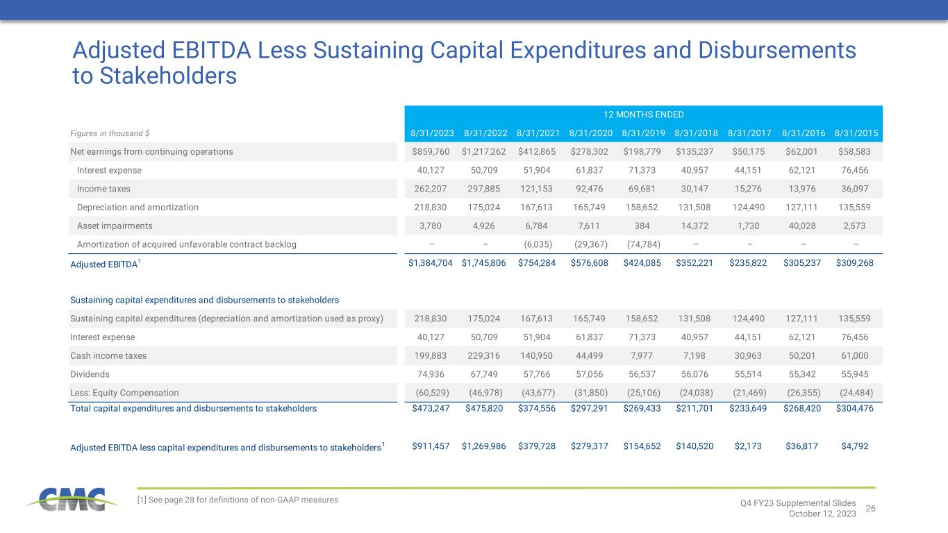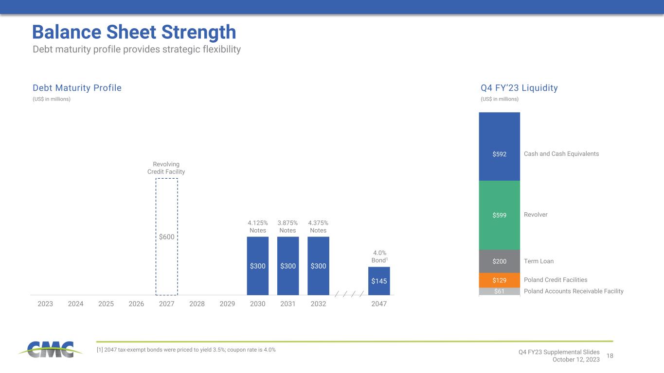 17 $5 $37 $2 $141 $155 $279 $380 $1,270 $911 $0 $200 $400 $600 $800 $1,000 $1,200 $1,400 FY 2015 FY 2016 FY 2017 FY 2018 FY 2019 FY 2020 FY 2021 FY 2022 FY 2023 Cash Generation Profile Adjusted EBITDA Less Sustaining Capital Expenditures and Disbursements to Stakeholders 1 (in millions) CMC’s cash flow capabilities have been greatly enhanced through our strategic transformation FY 2024 capital expenditures expected in a range of $550 million to $600 million Source: Public filings, Internal data [1] Adjusted EBITDA less Sustaining Capital Expenditures and Disbursements to Stakeholders is a non-GAAP financial measure. For reconciliations of non- GAAP financial measures to the most directly comparable GAAP financial measures, see the appendix to this document. Gain on California land sale Q4 FY23 Supplemental Slides October 12, 2023