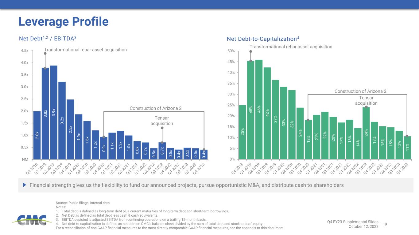 19 2 .0 x 3 .8 x 3 .9 x 3 .2 x 2 .5 x 1 .9 x 1 .6 x 1 .2 x 0 .9 x 1 .1 x 1 .2 x 1 .0 x 0 .8 x 0 .7 x 0 .5 x 0 .7 x 0 .5 x 0 .4 x 0 .5 x 0 .5 x 0 .4 x NM 0.5x 1.0x 1.5x 2.0x 2.5x 3.0x 3.5x 4.0x 4.5x 2 5 % 4 5 % 4 6 % 4 2 % 3 7 % 3 3 % 3 2 % 2 4 % 1 8 % 2 1 % 2 2 % 2 0 % 1 7 % 1 8 % 1 4 % 2 4 % 1 7 % 1 5 % 1 5 % 1 3 % 1 1 % 0% 5% 10% 15% 20% 25% 30% 35% 40% 45% 50% Source: Public filings, Internal data Notes: 1. Total debt is defined as long-term debt plus current maturities of long-term debt and short-term borrowings. 2. Net Debt is defined as total debt less cash & cash equivalents. 3. EBITDA depicted is adjusted EBITDA from continuing operations on a trailing 12-month basis. 4. Net debt-to-capitalization is defined as net debt on CMC’s balance sheet divided by the sum of total debt and stockholders’ equity. For a reconciliation of non-GAAP financial measures to the most directly comparable GAAP financial measures, see the appendix to this document. Leverage Profile Financial strength gives us the flexibility to fund our announced projects, pursue opportunistic M&A, and distribute cash to shareholders Net Debt1,2 / EBITDA3 Net Debt-to-Capitalization4 Transformational rebar asset acquisition Tensar acquisition Construction of Arizona 2 Transformational rebar asset acquisition Tensar acquisition Construction of Arizona 2 Q4 FY23 Supplemental Slides October 12, 2023