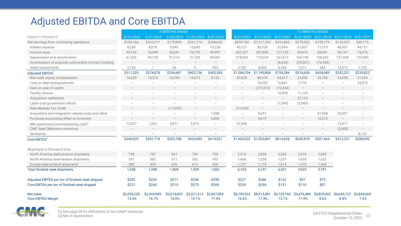 22 Figures in thousand $ 8/31/2023 5/31/2023 2/28/2023 11/30/2022 8/31/2022 8/31/2023 8/31/2022 8/31/2021 8/31/2020 8/31/2019 8/31/2018 8/31/2017 Net earnings from continuing operations $184,166 $233,971 $179,849 $261,774 $288,630 $859,760 $1,217,262 $412,865 $278,302 $198,779 $135,237 $50,175 Interest expense 8,259 8,878 9,945 13,045 14,230 40,127 50,709 51,904 61,837 71,373 40,957 44,151 Income taxes 53,742 76,099 55,641 76,725 49,991 262,207 297,885 121,153 92,476 69,681 30,147 15,276 Depreciation and amortization 61,302 55,129 51,216 51,183 49,081 218,830 175,024 167,613 165,749 158,652 131,508 124,490 Amortization of acquired unfavorable contract backlog – – – – – – – (6,035) (29,367) (74,784) – – Asset impairments 3,734 1 36 9 453 3,780 4,926 6,784 7,611 384 14,372 1,730 Adjusted EBITDA1 $311,203 $374,078 $296,687 $402,736 $402,385 $1,384,704 $1,745,806 $754,284 $576,608 $424,085 $352,221 $235,822 Non-cash equity compensation 16,529 10,376 16,949 16,675 9,122 60,529 46,978 43,677 31,850 25,106 24,038 21,469 Loss on debt extinguishment – – – – – – 16,052 16,841 1,778 – – 22,672 Gain on sale of assets – – – – – – (273,315) (10,334) – – – – Facility closure – – – – – – – 10,908 11,105 – – – Acquisition settlement – – – – – – – – 32,123 – – – Labor cost government refund – – – – – – – (1,348) (2,985) – – – New Markets Tax Credit – – (17,659) – – (17,659) – – – – – – Acquisition and integration related costs and other – – – – 1,008 – 8,651 – – 41,958 25,507 – Purchase accounting effect on inventory – – – – 6,506 – 8,675 – – 10,315 – – Mill operational commissioning costs2 12,297 7,264 6,811 5,574 – 31,946 – – – – 13,471 – CMC Steel Oklahoma incentives – – – – – – – – – – (3,000) – Severance – – – – – – – – – – – 8,129 Core EBITDA 1 $340,029 $391,718 $302,788 $424,985 $419,021 $1,459,520 $1,552,847 $814,028 $650,479 $501,464 $412,237 $288,092 Shipments in thousand tons North America steel product shipments 758 787 661 704 700 2,910 2,830 3,050 2,816 2,699 North America downstream shipments 391 382 311 382 432 1,466 1,558 1,537 1,635 1,632 Europe steel product shipments 389 429 436 473 428 1,727 1,719 1,614 1,472 1,460 Total finished steel shipments 1,538 1,598 1,408 1,559 1,560 6,103 6,107 6,201 5,923 5,791 Adjusted EBITDA per ton of finished steel shipped $202 $234 $211 $258 $258 $227 $286 $122 $97 $73 Core EBITDA per ton of finished steel shipped $221 $245 $215 $273 $269 $239 $254 $131 $110 $87 Net sales $2,209,228 $2,344,989 $2,018,003 $2,227,313 $2,407,065 $8,799,533 $8,913,481 $6,729,760 $5,476,486 $5,829,002 $4,643,723 $3,844,069 Core EBITDA Margin 15.4% 16.7% 15.0% 19.1% 17.4% 16.6% 17.4% 12.1% 11.9% 8.6% 8.9% 7.5% 12 MONTHS ENDED12 MONTHS ENDED3 MONTHS ENDED Adjusted EBITDA and Core EBITDA [1] See page 28 for definitions of non-GAAP measures [2] Net of depreciation Q4 FY23 Supplemental Slides October 12, 2023
