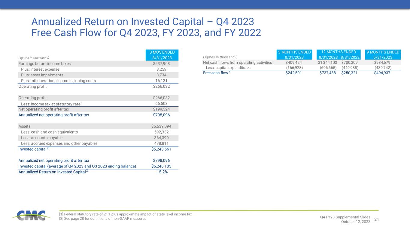 23 Adjusted Earnings [1] See page 28 for definitions of non-GAAP measures Q4 FY23 Supplemental Slides October 12, 2023 12 MONTHS ENDED Figures in thousand $ 8/31/2023 5/31/2023 2/28/2023 11/30/2022 8/31/2022 8/31/2023 Net earnings from continuing operations $184,166 $233,971 $179,849 $261,774 $288,630 $859,760 Asset impairments 3,734 1 36 9 453 3,780 New Markets Tax Credit – – (17,659) – – (17,659) Acquisition and integration related costs and other – – – – 1,008 – Purchase accounting effect on inventory – – – – 6,506 – Mill operational commissioning costs 16,131 7,287 6,825 5,584 – 35,827 Total adjustments (pre-tax) $19,865 $7,288 ($10,798) $5,593 $7,967 $21,948 Tax impact Related tax effects on adjustments (4,172) (1,530) 2,268 (1,175) (1,673) (4,609) Total tax impact ($4,172) ($1,530) $2,268 ($1,175) ($1,673) ($4,609) Adjusted earnings1 $199,859 $239,729 $171,319 $266,192 $294,924 $877,099 Average diluted shares outstanding (thousands) 118,218 118,398 118,723 118,925 120,457 118,606 Adjusted earnings per diluted share $1.69 $2.02 $1.44 $2.24 $2.45 $7.40 3 MONTHS ENDED