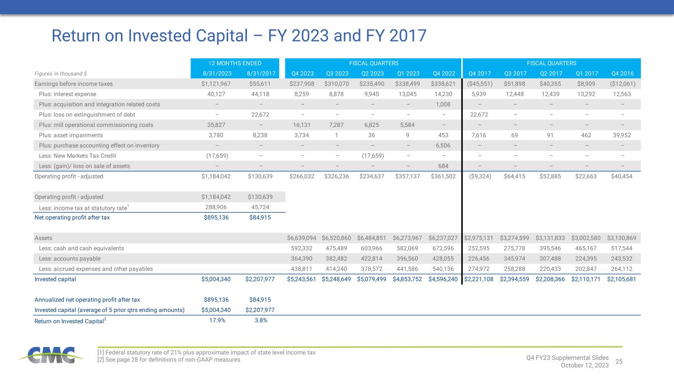 25 FISCAL QUARTERS FISCAL QUARTERS Figures in thousand $ 8/31/2023 8/31/2017 Q4 2023 Q3 2023 Q2 2023 Q1 2023 Q4 2022 Q4 2017 Q3 2017 Q2 2017 Q1 2017 Q4 2016 Earnings before income taxes $1,121,967 $55,611 $237,908 $310,070 $235,490 $338,499 $338,621 ($45,551) $51,898 $40,355 $8,909 ($12,061) Plus: interest expense 40,127 44,118 8,259 8,878 9,945 13,045 14,230 5,939 12,448 12,439 13,292 12,563 Plus: acquisition and integration related costs – – – – – – 1,008 – – – – – Plus: loss on extinguishment of debt – 22,672 – – – – – 22,672 – – – – Plus: mill operational commissioning costs 35,827 – 16,131 7,287 6,825 5,584 – – – – – – Plus: asset impairments 3,780 8,238 3,734 1 36 9 453 7,616 69 91 462 39,952 Plus: purchase accounting effect on inventory – – – – – – 6,506 – – – – – Less: New Markets Tax Credit (17,659) – – – (17,659) – – – – – – – Less: (gain)/ loss on sale of assets – – – – – – 684 – – – – – Operating profit - adjusted $1,184,042 $130,639 $266,032 $326,236 $234,637 $357,137 $361,502 ($9,324) $64,415 $52,885 $22,663 $40,454 Operating profit - adjusted $1,184,042 $130,639 Less: income tax at statutory rate1 288,906 45,724 Net operating profit after tax $895,136 $84,915 Assets $6,431,160 $6,639,094 $6,520,860 $6,484,851 $6,273,967 $6,237,027 $2,975,131 $3,274,599 $3,131,833 $3,002,580 $3,130,869 Less: cash and cash equivalents 585,290 592,332 475,489 603,966 582,069 672,596 252,595 275,778 395,546 465,167 517,544 Less: accounts payable $398,860 364,390 382,482 422,814 396,560 428,055 226,456 345,974 307,488 224,395 243,532 Less: accrued expenses and other payables 442,669 438,811 414,240 378,572 441,586 540,136 274,972 258,288 220,433 202,847 264,112 Invested capital $5,004,340 $2,207,977 $5,243,561 $5,248,649 $5,079,499 $4,853,752 $4,596,240 $2,221,108 $2,394,559 $2,208,366 $2,110,171 $2,105,681 Annualized net operating profit after tax $895,136 $84,915 Invested capital (average of 5 prior qtrs ending amounts) $5,004,340 $2,207,977 Return on Invested Capital 2 17.9% 3.8% 12 MONTHS ENDED Return on Invested Capital – FY 2023 and FY 2017 [1] Federal statutory rate of 21% plus approximate impact of state level income tax [2] See page 28 for definitions of non-GAAP measures Q4 FY23 Supplemental Slides October 12, 2023
