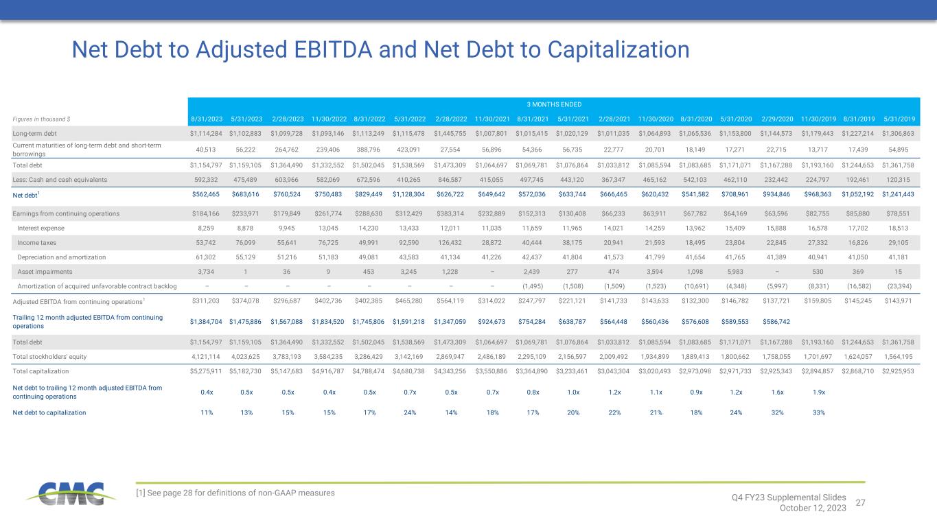 26 [1] See page 28 for definitions of non-GAAP measures Adjusted EBITDA Less Sustaining Capital Expenditures and Disbursements to Stakeholders Figures in thousand $ 8/31/2023 8/31/2022 8/31/2021 8/31/2020 8/31/2019 8/31/2018 8/31/2017 8/31/2016 8/31/2015 Net earnings from continuing operations $859,760 $1,217,262 $412,865 $278,302 $198,779 $135,237 $50,175 $62,001 $58,583 Interest expense 40,127 50,709 51,904 61,837 71,373 40,957 44,151 62,121 76,456 Income taxes 262,207 297,885 121,153 92,476 69,681 30,147 15,276 13,976 36,097 Depreciation and amortization 218,830 175,024 167,613 165,749 158,652 131,508 124,490 127,111 135,559 Asset impairments 3,780 4,926 6,784 7,611 384 14,372 1,730 40,028 2,573 Amortization of acquired unfavorable contract backlog – – (6,035) (29,367) (74,784) – – – – Adjusted EBITDA 1 $1,384,704 $1,745,806 $754,284 $576,608 $424,085 $352,221 $235,822 $305,237 $309,268 Sustaining capital expenditures and disbursements to stakeholders Sustaining capital expenditures (depreciation and amortization used as proxy) 218,830 175,024 167,613 165,749 158,652 131,508 124,490 127,111 135,559 Interest expense 40,127 50,709 51,904 61,837 71,373 40,957 44,151 62,121 76,456 Cash income taxes 199,883 229,316 140,950 44,499 7,977 7,198 30,963 50,201 61,000 Dividends 74,936 67,749 57,766 57,056 56,537 56,076 55,514 55,342 55,945 Less: Equity Compensation (60,529) (46,978) (43,677) (31,850) (25,106) (24,038) (21,469) (26,355) (24,484) Total capital expenditures and disbursements to stakeholders $473,247 $475,820 $374,556 $297,291 $269,433 $211,701 $233,649 $268,420 $304,476 Adjusted EBITDA less capital expenditures and disbursements to stakeholders 1 $911,457 $1,269,986 $379,728 $279,317 $154,652 $140,520 $2,173 $36,817 $4,792 12 MONTHS ENDED Q4 FY23 Supplemental Slides October 12, 2023