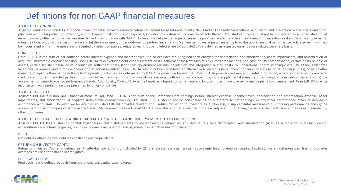 28 Definitions for non-GAAP financial measures ADJUSTED EARNINGS Adjusted earnings is a non-GAAP financial measure that is equal to earnings before settlement for asset impairments, New Market Tax Credit transactions, acquisition and integration related costs and other, purchase accounting effect on inventory, and mill operational commissioning costs, including the estimated income tax effects thereof. Adjusted earnings should not be considered as an alternative to net earnings or any other performance measure derived in accordance with GAAP. However, we believe that adjusted earnings provides relevant and useful information to investors as it allows: (i) a supplemental measure of our ongoing core performance and (ii) the assessment of period-to-period performance trends. Management uses adjusted earnings to evaluate our financial performance. Adjusted earnings may be inconsistent with similar measures presented by other companies. Adjusted earnings per diluted share (or adjusted EPS) is defined as adjusted earnings on a diluted per share basis. CORE EBITDA Core EBITDA is the sum of net earnings before interest expense and income taxes. It also excludes recurring non-cash charges for depreciation and amortization, asset impairments, and amortization of acquired unfavorable contract backlog. Core EBITDA also excludes debt extinguishment costs, settlement for New Market Tax Credit transactions, non-cash equity compensation, certain gains on sale of assets, certain facility closure costs, acquisition settlement costs, labor cost government refunds, acquisition and integration related costs, mill operational commissioning costs, CMC Steel Oklahoma incentives, severance, and purchase accounting effect on inventory. Core EBITDA should not be considered an alternative to earnings (loss) from continuing operations or net earnings (loss), or as a better measure of liquidity than net cash flows from operating activities, as determined by GAAP. However, we believe that Core EBITDA provides relevant and useful information, which is often used by analysts, creditors and other interested parties in our industry as it allows: (i) comparison of our earnings to those of our competitors; (ii) a supplemental measure of our ongoing core performance; and (iii) the assessment of period-to-period performance trends. Additionally, Core EBITDA is the target benchmark for our annual and long-term cash incentive performance plans for management. Core EBITDA may be inconsistent with similar measures presented by other companies. ADJUSTED EBITDA Adjusted EBITDA is a non-GAAP financial measure. Adjusted EBITDA is the sum of the Company’s net earnings before interest expense, income taxes, depreciation and amortization expense, asset impairments, and amortization of acquired unfavorable contract backlog. Adjusted EBITDA should not be considered as an alternative to net earnings, or any other performance measure derived in accordance with GAAP. However, we believe that adjusted EBITDA provides relevant and useful information to investors as it allows: (i) a supplemental measure of our ongoing performance and (ii) the assessment of period-to-period performance trends. Management uses adjusted EBITDA to evaluate our financial performance. Adjusted EBITDA may be inconsistent with similar measures presented by other companies. ADJUSTED EBITDA LESS SUSTAINING CAPITAL EXPENDITURES AND DISBURSEMENTS TO STAKEHOLDERS Adjusted EBITDA less sustaining capital expenditures and disbursements to shareholders is defined as Adjusted EBITDA less depreciation and amortization (used as a proxy for sustaining capital expenditures) less interest expense, less cash income taxes less dividend payments plus stock-based compensation. NET DEBT Net debt is defined as total debt less cash and cash equivalents. RETURN ON INVESTED CAPITAL Return on Invested Capital is defined as: 1) after-tax operating profit divided by 2) total assets less cash & cash equivalents less non-interest-bearing liabilities. For annual measures, trailing 5-quarter averages are used for balance sheet figures. FREE CASH FLOW Free cash flow is defined as cash from operations less capital expenditures. Q4 FY23 Supplemental Slides October 12, 2023