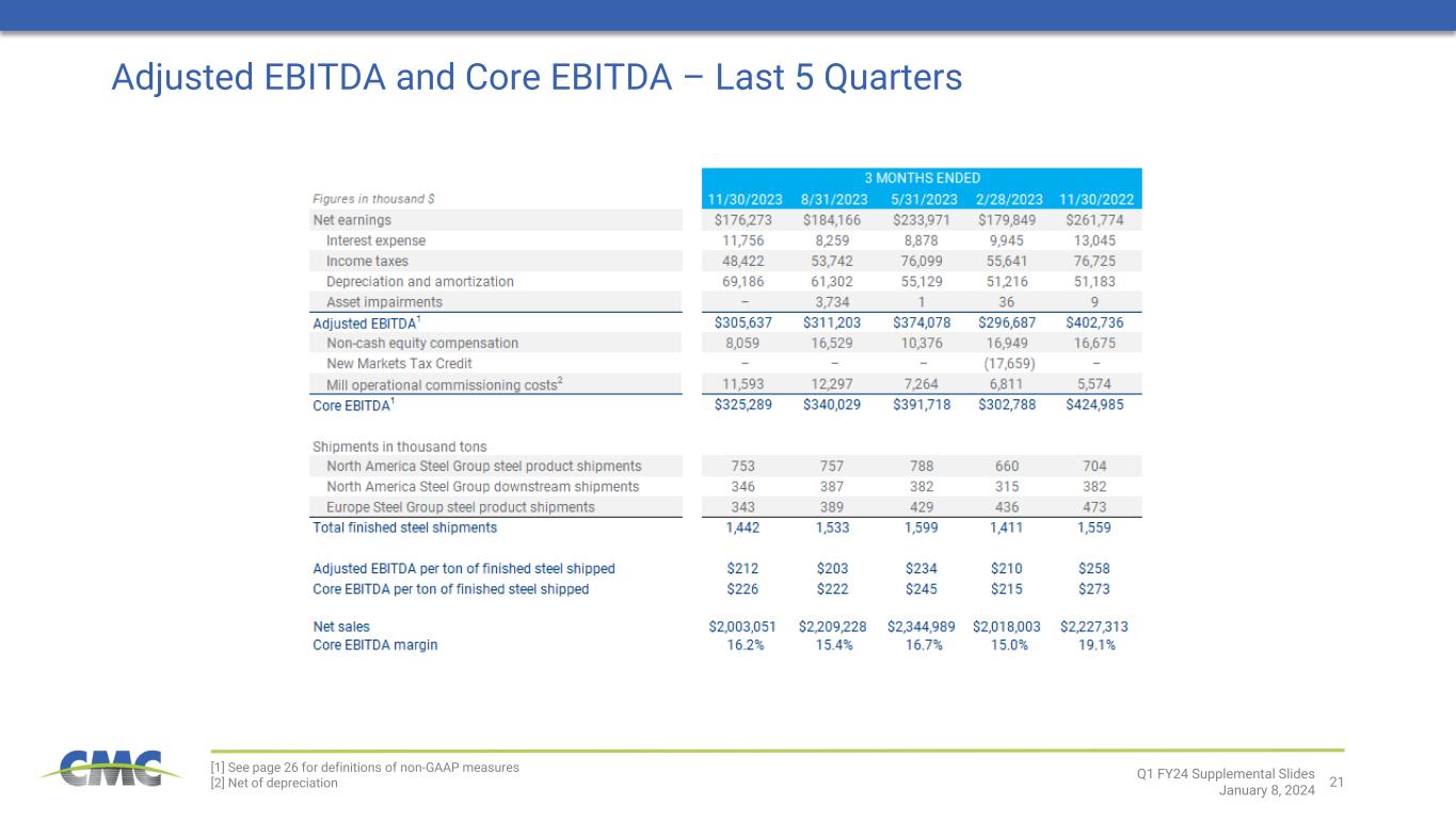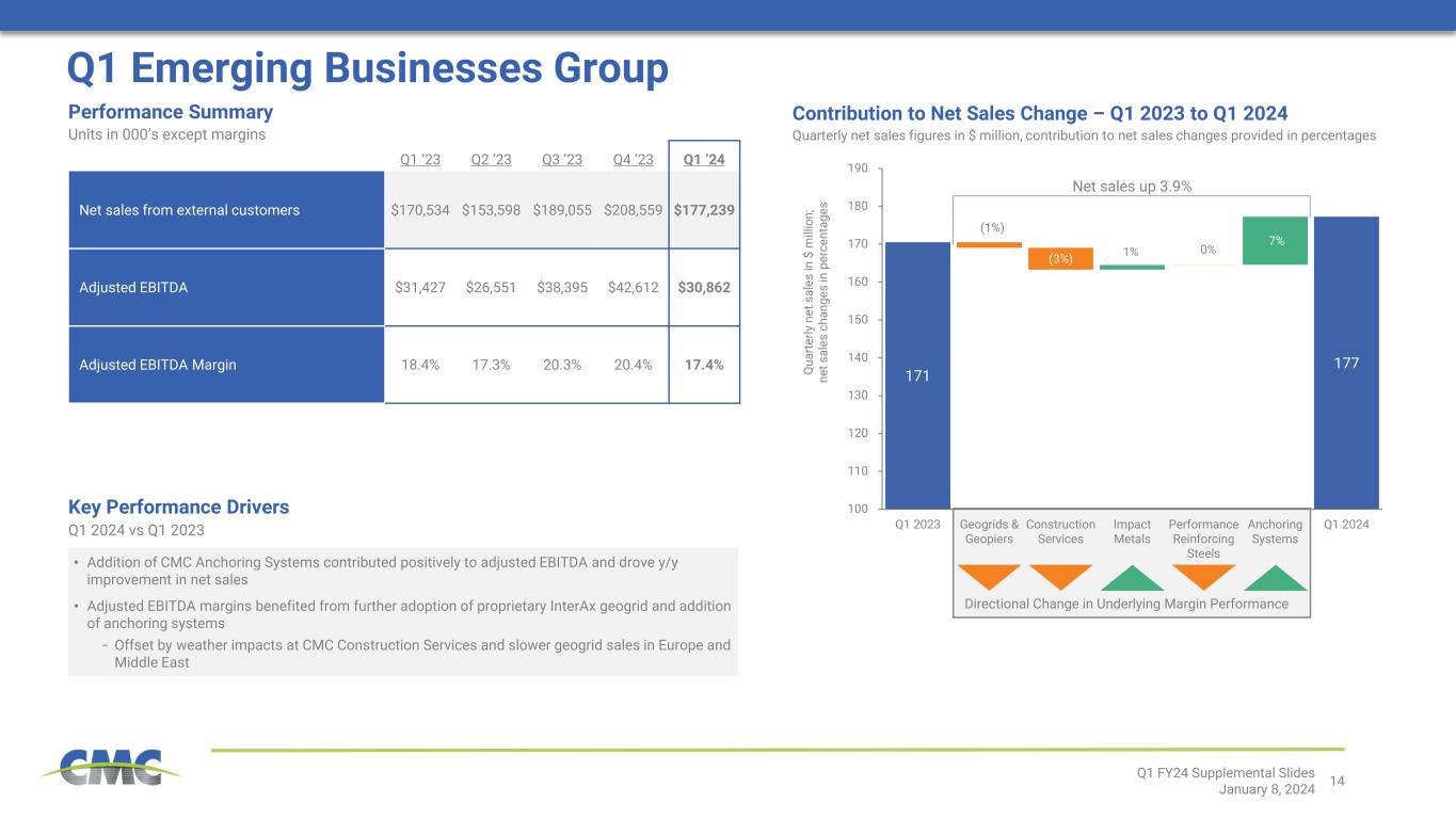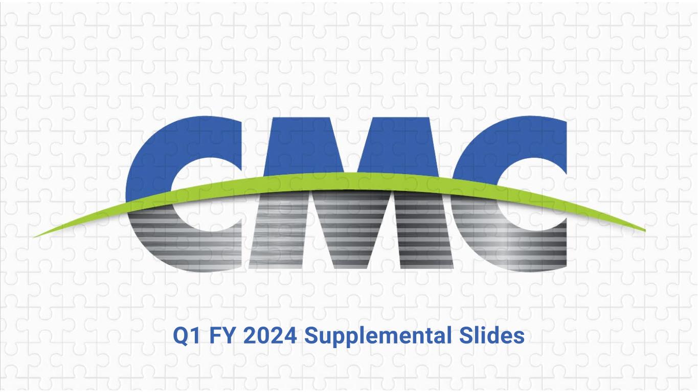 2Q1 FY24 Supplemental Slides January 8, 2024 This presentation contains forward-looking statements within the meaning of the federal securities laws with respect to general economic conditions, key macro-economic drivers that impact our business, the effects of ongoing trade actions, the effects of continued pressure on the liquidity of our customers, potential synergies and organic growth provided by acquisitions and strategic investments, demand for our products, shipment volumes, metal margins, the ability to operate our steel mills at full capacity, future availability and cost of supplies of raw materials and energy for our operations, growth rates in certain segments, product margins within our Emerging Businesses Group, share repurchases, legal proceedings, construction activity, international trade, the impact of the Russian invasion of Ukraine, capital expenditures, tax credits, our liquidity and our ability to satisfy future liquidity requirements, estimated contractual obligations, the expected capabilities and benefits of new facilities, the timeline for execution of our growth plan and our expectations or beliefs concerning future events. The statements in this presentation that are not historical statements, are forward-looking statements. These forward-looking statements can generally be identified by phrases such as we or our management “expects,” “anticipates,” “believes,” “estimates,” “future,” “intends,” “may,” “plans to,” “ought,” “could,” “will,” “should,” “likely,” “appears,” “projects,” “forecasts,” “outlook” or other similar words or phrases, as well as by discussions of strategy, plans or intentions. Our forward-looking statements are based on management’s expectations and beliefs as of the date of this presentation. Although we believe that our expectations are reasonable, we can give no assurance that these expectations will prove to have been correct, and actual results may vary materially. Except as required by law, we undertake no obligation to update, amend or clarify any forward-looking statements to reflect changed assumptions, the occurrence of anticipated or unanticipated events, new information or circumstances or any other changes. Important factors that could cause actual results to differ materially from our expectations include those described in our filings with the Securities and Exchange Commission, including, but not limited to, in Part I, Item 1A, “Risk Factors” of our annual report on Form 10-K for the fiscal year ended August 31, 2023, as well as the following: changes in economic conditions which affect demand for our products or construction activity generally, and the impact of such changes on the highly cyclical steel industry; rapid and significant changes in the price of metals, potentially impairing our inventory values due to declines in commodity prices or reducing the profitability of downstream contracts within our vertically integrated steel operations due to rising commodity pricing; excess capacity in our industry, particularly in China, and product availability from competing steel mills and other steel suppliers including import quantities and pricing; the impact of the Russian invasion of Ukraine on the global economy, inflation, energy supplies and raw materials; increased attention to environmental, social and governance (“ESG”) matters, including any targets or other ESG or environmental justice initiatives; operating and start-up risks, as well as market risks associated with the commissioning of new projects could prevent us from realizing anticipated benefits and could result in a loss of all or a substantial part of our investments; impacts from global public health crises on the economy, demand for our products, global supply chain and on our operations; compliance with and changes in existing and future laws, regulations and other legal requirements and judicial decisions that govern our business, including increased environmental regulations associated with climate change and greenhouse gas emissions; involvement in various environmental matters that may result in fines, penalties or judgments; evolving remediation technology, changing regulations, possible third-party contributions, the inherent uncertainties of the estimation process and other factors that may impact amounts accrued for environmental liabilities; potential limitations in our or our customers' abilities to access credit and non-compliance with their contractual obligations, including payment obligations; activity in repurchasing shares of our common stock under our share repurchase program; financial and non-financial covenants and restrictions on the operation of our business contained in agreements governing our debt; our ability to successfully identify, consummate and integrate acquisitions and realize any or all of the anticipated synergies or other benefits of acquisitions; the effects that acquisitions may have on our financial leverage; risks associated with acquisitions generally, such as the inability to obtain, or delays in obtaining, required approvals under applicable antitrust legislation and other regulatory and third-party consents and approvals; lower than expected future levels of revenues and higher than expected future costs; failure or inability to implement growth strategies in a timely manner; the impact of goodwill or other indefinite-lived intangible asset impairment charges; the impact of long-lived asset impairment charges; currency fluctuations; global factors, such as trade measures, military conflicts and political uncertainties, including changes to current trade regulations, such as Section 232 trade tariffs and quotas, tax legislation and other regulations which might adversely impact our business; availability and pricing of electricity, electrodes and natural gas for mill operations; our ability to hire and retain key executives and oth