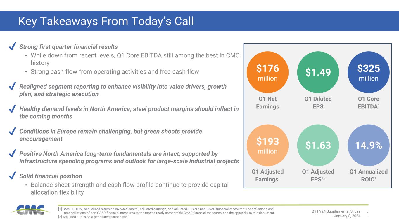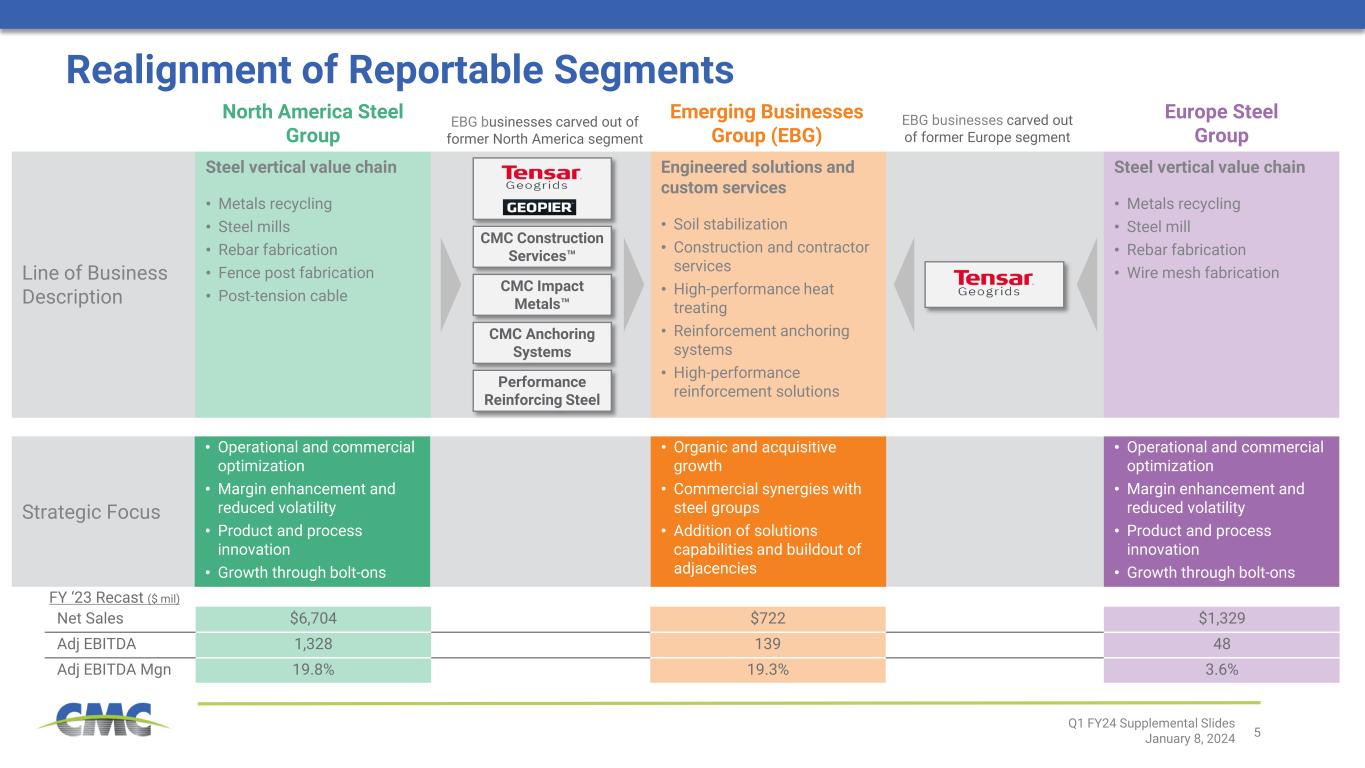 4 Key Takeaways From Today’s Call Strong first quarter financial results • While down from recent levels, Q1 Core EBITDA still among the best in CMC history • Strong cash flow from operating activities and free cash flow Realigned segment reporting to enhance visibility into value drivers, growth plan, and strategic execution Healthy demand levels in North America; steel product margins should inflect in the coming months Conditions in Europe remain challenging, but green shoots provide encouragement Positive North America long-term fundamentals are intact, supported by infrastructure spending programs and outlook for large-scale industrial projects Solid financial position • Balance sheet strength and cash flow profile continue to provide capital allocation flexibility Q1 FY24 Supplemental Slides January 8, 2024 $1.49 Q1 Diluted EPS [1] Core EBITDA , annualized return on invested capital, adjusted earnings, and adjusted EPS are non-GAAP financial measures. For definitions and reconciliations of non-GAAP financial measures to the most directly comparable GAAP financial measures, see the appendix to this document. [2] Adjusted EPS is on a per diluted share basis $325 million $1.63 14.9% Q1 Core EBITDA1 Q1 Adjusted EPS1,2 Q1 Annualized ROIC1 ✔ ✔ ✔ ✔ ✔ ✔ $176 million Q1 Net Earnings $193 million Q1 Adjusted Earnings1