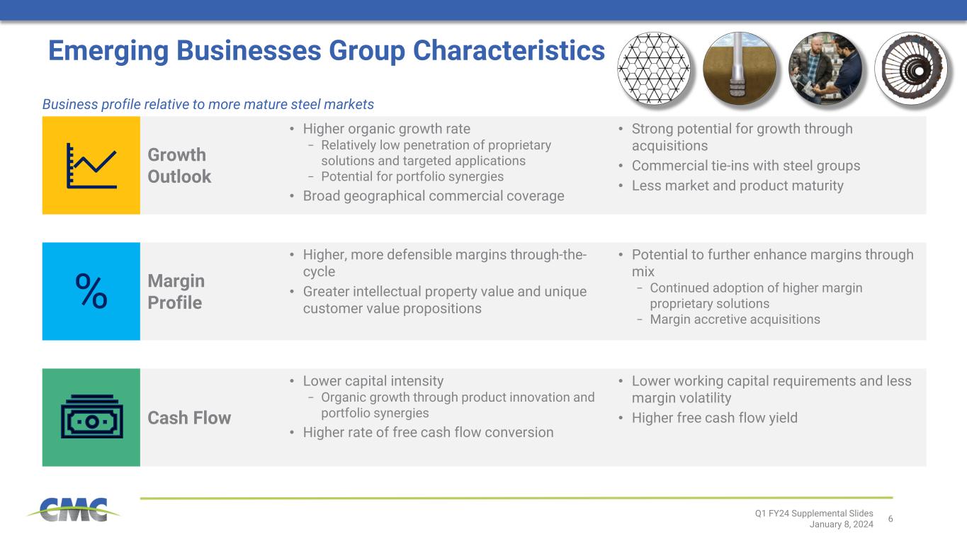 5 Line of Business Description Strategic Focus Realignment of Reportable Segments Q1 FY24 Supplemental Slides January 8, 2024 Steel vertical value chain • Metals recycling • Steel mills • Rebar fabrication • Fence post fabrication • Post-tension cable Engineered solutions and custom services • Soil stabilization • Construction and contractor services • High-performance heat treating • Reinforcement anchoring systems • High-performance reinforcement solutions Steel vertical value chain • Metals recycling • Steel mill • Rebar fabrication • Wire mesh fabrication Performance Reinforcing Steel CMC Impact Metals™ CMC Construction Services™ CMC Anchoring Systems North America Steel Group Emerging Businesses Group (EBG) Europe Steel Group EBG businesses carved out of former Europe segment FY ‘23 Recast ($ mil) Net Sales $6,704 $722 $1,329 Adj EBITDA 1,328 139 48 Adj EBITDA Mgn 19.8% 19.3% 3.6% • Operational and commercial optimization • Margin enhancement and reduced volatility • Product and process innovation • Growth through bolt-ons • Organic and acquisitive growth • Commercial synergies with steel groups • Addition of solutions capabilities and buildout of adjacencies EBG businesses carved out of former North America segment • Operational and commercial optimization • Margin enhancement and reduced volatility • Product and process innovation • Growth through bolt-ons