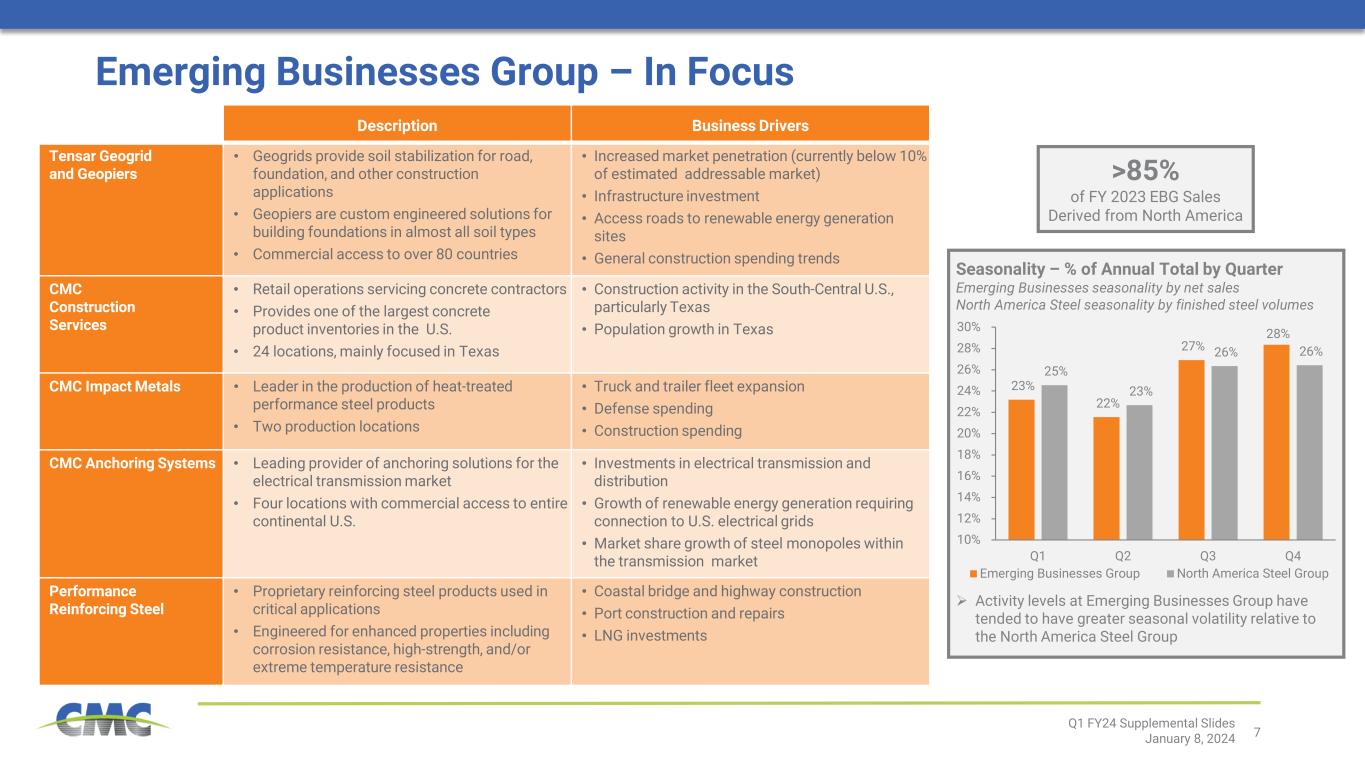 6 Cash Flow Margin Profile Growth Outlook Emerging Businesses Group Characteristics Q1 FY24 Supplemental Slides January 8, 2024 % • Higher organic growth rate − Relatively low penetration of proprietary solutions and targeted applications − Potential for portfolio synergies • Broad geographical commercial coverage • Strong potential for growth through acquisitions • Commercial tie-ins with steel groups • Less market and product maturity Business profile relative to more mature steel markets • Higher, more defensible margins through-the- cycle • Greater intellectual property value and unique customer value propositions • Potential to further enhance margins through mix − Continued adoption of higher margin proprietary solutions − Margin accretive acquisitions • Lower capital intensity − Organic growth through product innovation and portfolio synergies • Higher rate of free cash flow conversion • Lower working capital requirements and less margin volatility • Higher free cash flow yield