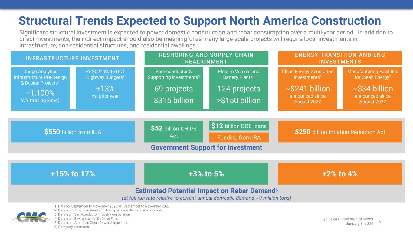 7 Description Business Drivers Tensar Geogrid and Geopiers • Geogrids provide soil stabilization for road, foundation, and other construction applications • Geopiers are custom engineered solutions for building foundations in almost all soil types • Commercial access to over 80 countries • Increased market penetration (currently below 10% of estimated addressable market) • Infrastructure investment • Access roads to renewable energy generation sites • General construction spending trends CMC Construction Services • Retail operations servicing concrete contractors • Provides one of the largest concrete product inventories in the U.S. • 24 locations, mainly focused in Texas • Construction activity in the South-Central U.S., particularly Texas • Population growth in Texas CMC Impact Metals • Leader in the production of heat-treated performance steel products • Two production locations • Truck and trailer fleet expansion • Defense spending • Construction spending CMC Anchoring Systems • Leading provider of anchoring solutions for the electrical transmission market • Four locations with commercial access to entire continental U.S. • Investments in electrical transmission and distribution • Growth of renewable energy generation requiring connection to U.S. electrical grids • Market share growth of steel monopoles within the transmission market Performance Reinforcing Steel • Proprietary reinforcing steel products used in critical applications • Engineered for enhanced properties including corrosion resistance, high-strength, and/or extreme temperature resistance • Coastal bridge and highway construction • Port construction and repairs • LNG investments Emerging Businesses Group – In Focus >85% of FY 2023 EBG Sales Derived from North America 23% 22% 27% 28% 25% 23% 26% 26% 10% 12% 14% 16% 18% 20% 22% 24% 26% 28% 30% Q1 Q2 Q3 Q4 Emerging Businesses Group North America Steel Group Seasonality – % of Annual Total by Quarter Emerging Businesses seasonality by net sales North America Steel seasonality by finished steel volumes  Activity levels at Emerging Businesses Group have tended to have greater seasonal volatility relative to the North America Steel Group Q1 FY24 Supplemental Slides January 8, 2024