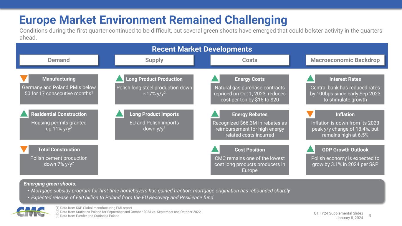 8 Structural Trends Expected to Support North America Construction RESHORING AND SUPPLY CHAIN REALIGNMENT ENERGY TRANSITION AND LNG INVESTMENTS Significant structural investment is expected to power domestic construction and rebar consumption over a multi-year period. In addition to direct investments, the indirect impact should also be meaningful as many large-scale projects will require local investments in infrastructure, non-residential structures, and residential dwellings. Semiconductor & Supporting Investments3 69 projects $315 billion Electric Vehicle and Battery Plants4 124 projects >$150 billion Clean Energy Generation Investments5 ~$241 billion announced since August 2022 [1] Data for September to November 2023 vs. September to November 2022 [2] Data from American Road and Transportation Builders’ Associations [3] Data from Semiconductor Industry Association [4] Data from Environmental Defense Fund [5] Data from American Clean Power Association [6] Company estimates Manufacturing Facilities for Clean Energy5 ~$34 billion announced since August 2022 INFRASTRUCTURE INVESTMENT Dodge Analytics Infrastructure Pre-Design & Design Projects1 +1,100% Y/Y (trailing 3-mo) FY 2024 State DOT Highway Budgets2 +13% vs. prior year Government Support for Investment $550 billion from IIJA $52 billion CHIPS Act $250 billion Inflation Reduction Act $12 billion DOE loans Funding from IRA Q1 FY24 Supplemental Slides January 8, 2024 Estimated Potential Impact on Rebar Demand6 (at full run-rate relative to current annual domestic demand ~9 million tons) +15% to 17% +3% to 5% +2% to 4%