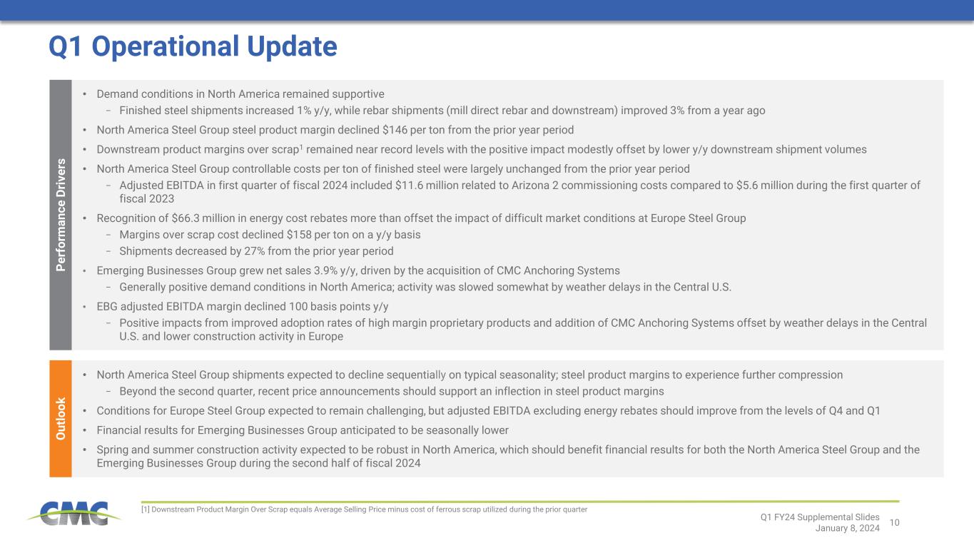 9 GDP Growth Outlook Polish economy is expected to grow by 3.1% in 2024 per S&P Recent Market Developments Europe Market Environment Remained Challenging [1] Data from S&P Global manufacturing PMI report [2] Data from Statistics Poland for September and October 2023 vs. September and October 2022 [3] Data from Eurofer and Statistics Poland Emerging green shoots: • Mortgage subsidy program for first-time homebuyers has gained traction; mortgage origination has rebounded sharply • Expected release of €60 billion to Poland from the EU Recovery and Resilience fund Conditions during the first quarter continued to be difficult, but several green shoots have emerged that could bolster activity in the quarters ahead. Demand Supply Costs Macroeconomic Backdrop Manufacturing Germany and Poland PMIs below 50 for 17 consecutive months1 Energy Costs Natural gas purchase contracts repriced on Oct 1, 2023; reduces cost per ton by $15 to $20 Long Product Imports EU and Polish imports down y/y3 Residential Construction Housing permits granted up 11% y/y2 Total Construction Polish cement production down 7% y/y2 Long Product Production Polish long steel production down ~17% y/y2 Energy Rebates Recognized $66.3M in rebates as reimbursement for high energy related costs incurred Interest Rates Central bank has reduced rates by 100bps since early Sep 2023 to stimulate growth Cost Position CMC remains one of the lowest cost long products producers in Europe Inflation Inflation is down from its 2023 peak y/y change of 18.4%, but remains high at 6.5% Q1 FY24 Supplemental Slides January 8, 2024