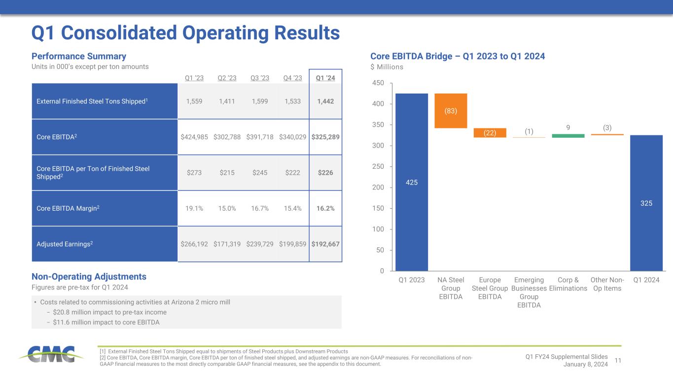 10 • North America Steel Group shipments expected to decline sequentially on typical seasonality; steel product margins to experience further compression − Beyond the second quarter, recent price announcements should support an inflection in steel product margins • Conditions for Europe Steel Group expected to remain challenging, but adjusted EBITDA excluding energy rebates should improve from the levels of Q4 and Q1 • Financial results for Emerging Businesses Group anticipated to be seasonally lower • Spring and summer construction activity expected to be robust in North America, which should benefit financial results for both the North America Steel Group and the Emerging Businesses Group during the second half of fiscal 2024 • Demand conditions in North America remained supportive − Finished steel shipments increased 1% y/y, while rebar shipments (mill direct rebar and downstream) improved 3% from a year ago • North America Steel Group steel product margin declined $146 per ton from the prior year period • Downstream product margins over scrap1 remained near record levels with the positive impact modestly offset by lower y/y downstream shipment volumes • North America Steel Group controllable costs per ton of finished steel were largely unchanged from the prior year period − Adjusted EBITDA in first quarter of fiscal 2024 included $11.6 million related to Arizona 2 commissioning costs compared to $5.6 million during the first quarter of fiscal 2023 • Recognition of $66.3 million in energy cost rebates more than offset the impact of difficult market conditions at Europe Steel Group − Margins over scrap cost declined $158 per ton on a y/y basis − Shipments decreased by 27% from the prior year period • Emerging Businesses Group grew net sales 3.9% y/y, driven by the acquisition of CMC Anchoring Systems − Generally positive demand conditions in North America; activity was slowed somewhat by weather delays in the Central U.S. • EBG adjusted EBITDA margin declined 100 basis points y/y − Positive impacts from improved adoption rates of high margin proprietary products and addition of CMC Anchoring Systems offset by weather delays in the Central U.S. and lower construction activity in Europe Pe rf or m an ce D riv er s O ut lo ok Q1 Operational Update [1] Downstream Product Margin Over Scrap equals Average Selling Price minus cost of ferrous scrap utilized during the prior quarter Q1 FY24 Supplemental Slides January 8, 2024