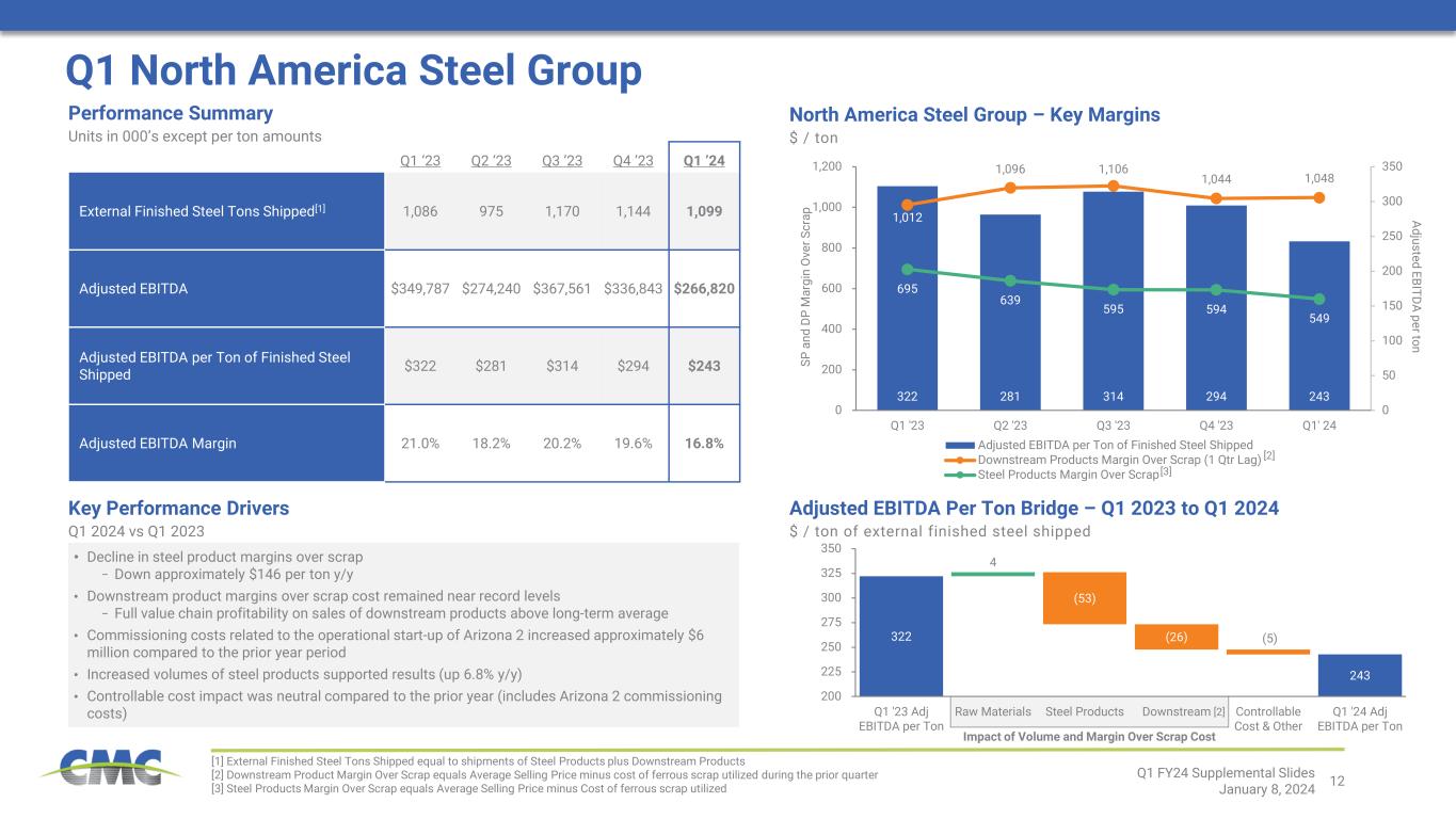 11 425 325 (83) (22) (1) 9 (3) 0 50 100 150 200 250 300 350 400 450 Q1 2023 NA Steel Group EBITDA Europe Steel Group EBITDA Emerging Businesses Group EBITDA Corp & Eliminations Other Non- Op Items Q1 2024 Q1 Consolidated Operating Results Q1 ’23 Q2 ’23 Q3 ’23 Q4 ’23 Q1 ’24 External Finished Steel Tons Shipped1 1,559 1,411 1,599 1,533 1,442 Core EBITDA2 $424,985 $302,788 $391,718 $340,029 $325,289 Core EBITDA per Ton of Finished Steel Shipped2 $273 $215 $245 $222 $226 Core EBITDA Margin2 19.1% 15.0% 16.7% 15.4% 16.2% Adjusted Earnings2 $266,192 $171,319 $239,729 $199,859 $192,667 Performance Summary Units in 000’s except per ton amounts • Costs related to commissioning activities at Arizona 2 micro mill − $20.8 million impact to pre-tax income − $11.6 million impact to core EBITDA Non-Operating Adjustments Figures are pre-tax for Q1 2024 [1] External Finished Steel Tons Shipped equal to shipments of Steel Products plus Downstream Products [2] Core EBITDA, Core EBITDA margin, Core EBITDA per ton of finished steel shipped, and adjusted earnings are non-GAAP measures. For reconciliations of non- GAAP financial measures to the most directly comparable GAAP financial measures, see the appendix to this document. Core EBITDA Bridge – Q1 2023 to Q1 2024 $ Millions Q1 FY24 Supplemental Slides January 8, 2024