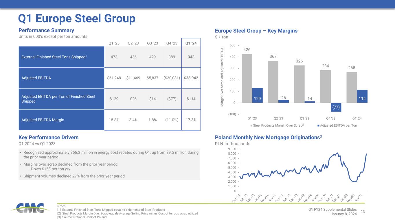 12 322 281 314 294 243 1,012 1,096 1,106 1,044 1,048 695 639 595 594 549 0 50 100 150 200 250 300 350 0 200 400 600 800 1,000 1,200 Q1 '23 Q2 '23 Q3 '23 Q4 '23 Q1' 24 Adjusted EBITDA per Ton of Finished Steel Shipped Downstream Products Margin Over Scrap (1 Qtr Lag) Steel Products Margin Over Scrap 322 243 4 (53) (26) (5) 200 225 250 275 300 325 350 Q1 '23 Adj EBITDA per Ton Raw Materials Steel Products Downstream Controllable Cost & Other Q1 '24 Adj EBITDA per Ton Key Performance Drivers Q1 2024 vs Q1 2023 Q1 North America Steel Group Q1 ‘23 Q2 ‘23 Q3 ’23 Q4 ’23 Q1 ’24 External Finished Steel Tons Shipped[1] 1,086 975 1,170 1,144 1,099 Adjusted EBITDA $349,787 $274,240 $367,561 $336,843 $266,820 Adjusted EBITDA per Ton of Finished Steel Shipped $322 $281 $314 $294 $243 Adjusted EBITDA Margin 21.0% 18.2% 20.2% 19.6% 16.8% Performance Summary Units in 000’s except per ton amounts • Decline in steel product margins over scrap − Down approximately $146 per ton y/y • Downstream product margins over scrap cost remained near record levels − Full value chain profitability on sales of downstream products above long-term average • Commissioning costs related to the operational start-up of Arizona 2 increased approximately $6 million compared to the prior year period • Increased volumes of steel products supported results (up 6.8% y/y) • Controllable cost impact was neutral compared to the prior year (includes Arizona 2 commissioning costs) [1] External Finished Steel Tons Shipped equal to shipments of Steel Products plus Downstream Products [2] Downstream Product Margin Over Scrap equals Average Selling Price minus cost of ferrous scrap utilized during the prior quarter [3] Steel Products Margin Over Scrap equals Average Selling Price minus Cost of ferrous scrap utilized North America Steel Group – Key Margins $ / ton SP a nd D P M ar gi n O ve r S cr ap Adjusted EBITDA per ton Adjusted EBITDA Per Ton Bridge – Q1 2023 to Q1 2024 $ / ton of external finished steel shipped [2] [3] [2] Impact of Volume and Margin Over Scrap Cost Q1 FY24 Supplemental Slides January 8, 2024