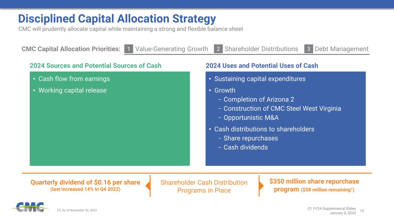 14 Key Performance Drivers Q1 2024 vs Q1 2023 Q1 Emerging Businesses Group Q1 ’23 Q2 ’23 Q3 ’23 Q4 ’23 Q1 ’24 Net sales from external customers $170,534 $153,598 $189,055 $208,559 $177,239 Adjusted EBITDA $31,427 $26,551 $38,395 $42,612 $30,862 Adjusted EBITDA Margin 18.4% 17.3% 20.3% 20.4% 17.4% Performance Summary Units in 000’s except margins • Addition of CMC Anchoring Systems contributed positively to adjusted EBITDA and drove y/y improvement in net sales • Adjusted EBITDA margins benefited from further adoption of proprietary InterAx geogrid and addition of anchoring systems − Offset by weather impacts at CMC Construction Services and slower geogrid sales in Europe and Middle East Contribution to Net Sales Change – Q1 2023 to Q1 2024 Quarterly net sales figures in $ million, contribution to net sales changes provided in percentages Q1 FY24 Supplemental Slides January 8, 2024 171 177 (1%) (3%) 1% 0% 7% 100 110 120 130 140 150 160 170 180 190 Q1 2023 Geogrids & Geopiers Construction Services Impact Metals Performance Reinforcing Steels Anchoring Systems Q1 2024 Q ua rt er ly n et s al es in $ m ill io n; ne t s al es c ha ng es in p er ce nt ag es Net sales up 3.9% Directional Change in Underlying Margin Performance