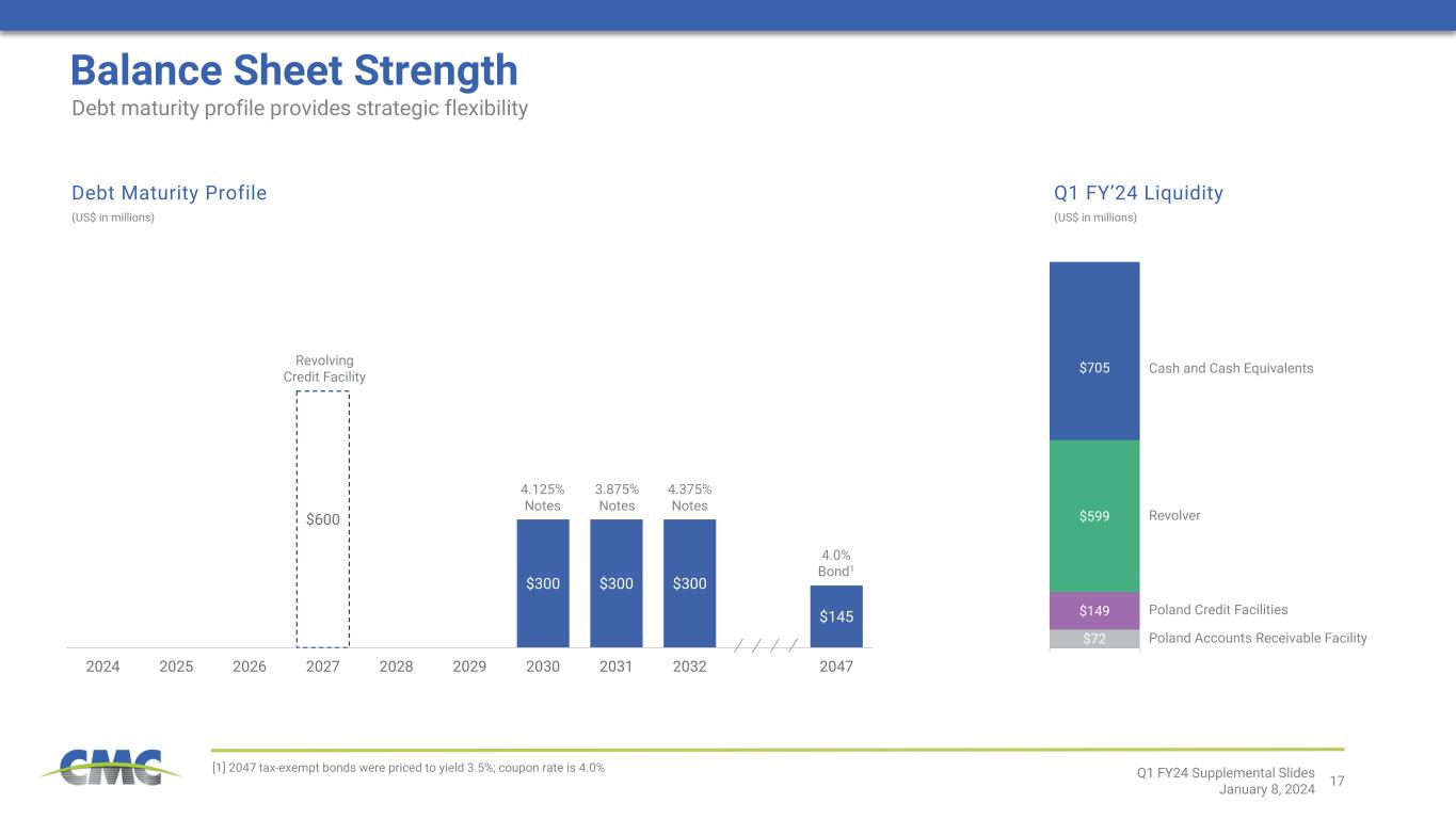 16 $803 $5 $37 $2 $141 $155 $279 $380 $1,270 $911 $0 $200 $400 $600 $800 $1,000 $1,200 $1,400 FY 2015 FY 2016 FY 2017 FY 2018 FY 2019 FY 2020 FY 2021 FY 2022 FY 2023 LTM Q1 '24 Cash Generation Profile Adjusted EBITDA Less Sustaining Capital Expenditures and Disbursements to Stakeholders1 (in millions) CMC’s cash flow capabilities have been greatly enhanced through our strategic transformation FY 2024 capital expenditures expected in a range of $550 million to $600 million Source: Public filings, Internal data [1] Adjusted EBITDA less Sustaining Capital Expenditures and Disbursements to Stakeholders is a non-GAAP financial measure. For reconciliations of non- GAAP financial measures to the most directly comparable GAAP financial measures, see the appendix to this document. Gain on California land sale Q1 FY24 Supplemental Slides January 8, 2024