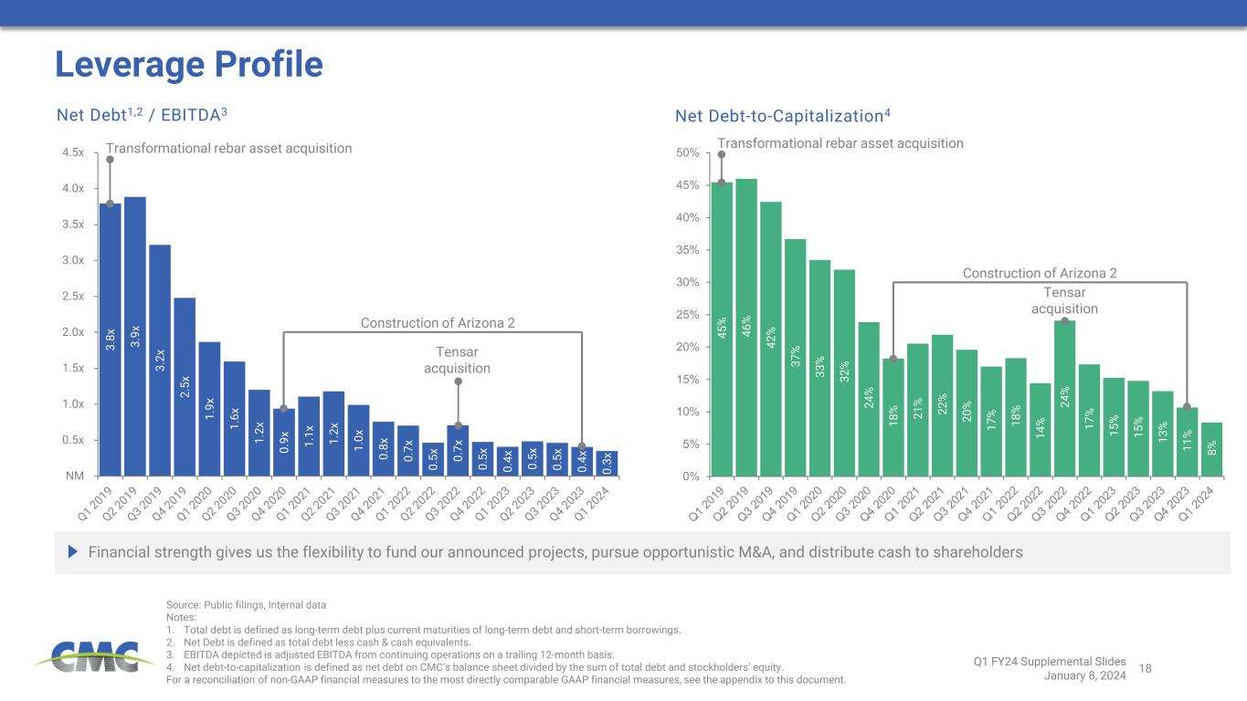 18 45 % 46 % 42 % 37 % 33 % 32 % 24 % 18 % 21 % 22 % 20 % 17 % 18 % 14 % 24 % 17 % 15 % 15 % 13 % 11 % 8% 0% 5% 10% 15% 20% 25% 30% 35% 40% 45% 50% 3. 8x 3. 9x 3. 2x 2. 5x 1. 9x 1. 6x 1. 2x 0. 9x 1. 1x 1. 2x 1. 0x 0. 8x 0. 7x 0. 5x 0. 7x 0. 5x 0. 4x 0. 5x 0. 5x 0. 4x 0. 3x NM 0.5x 1.0x 1.5x 2.0x 2.5x 3.0x 3.5x 4.0x 4.5x Source: Public filings, Internal data Notes: 1. Total debt is defined as long-term debt plus current maturities of long-term debt and short-term borrowings. 2. Net Debt is defined as total debt less cash & cash equivalents. 3. EBITDA depicted is adjusted EBITDA from continuing operations on a trailing 12-month basis. 4. Net debt-to-capitalization is defined as net debt on CMC’s balance sheet divided by the sum of total debt and stockholders’ equity. For a reconciliation of non-GAAP financial measures to the most directly comparable GAAP financial measures, see the appendix to this document. Leverage Profile Financial strength gives us the flexibility to fund our announced projects, pursue opportunistic M&A, and distribute cash to shareholders Net Debt1,2 / EBITDA3 Net Debt-to-Capitalization4 Transformational rebar asset acquisition Tensar acquisition Construction of Arizona 2 Transformational rebar asset acquisition Tensar acquisition Construction of Arizona 2 Q1 FY24 Supplemental Slides January 8, 2024