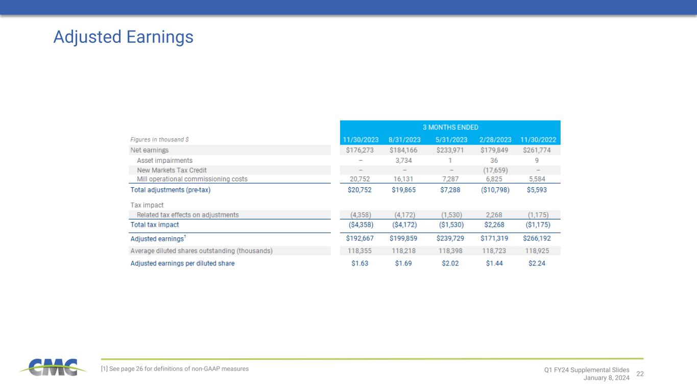 22 Adjusted Earnings [1] See page 26 for definitions of non-GAAP measures Q1 FY24 Supplemental Slides January 8, 2024