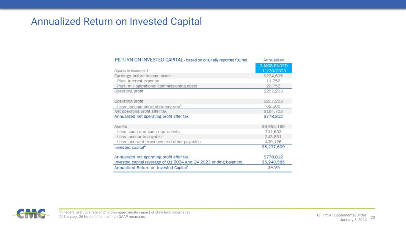 23 Annualized Return on Invested Capital [1] Federal statutory rate of 21% plus approximate impact of state level income tax [2] See page 26 for definitions of non-GAAP measures Q1 FY24 Supplemental Slides January 8, 2024 2