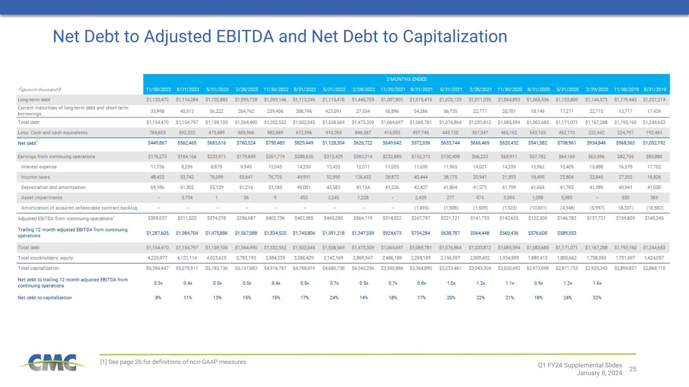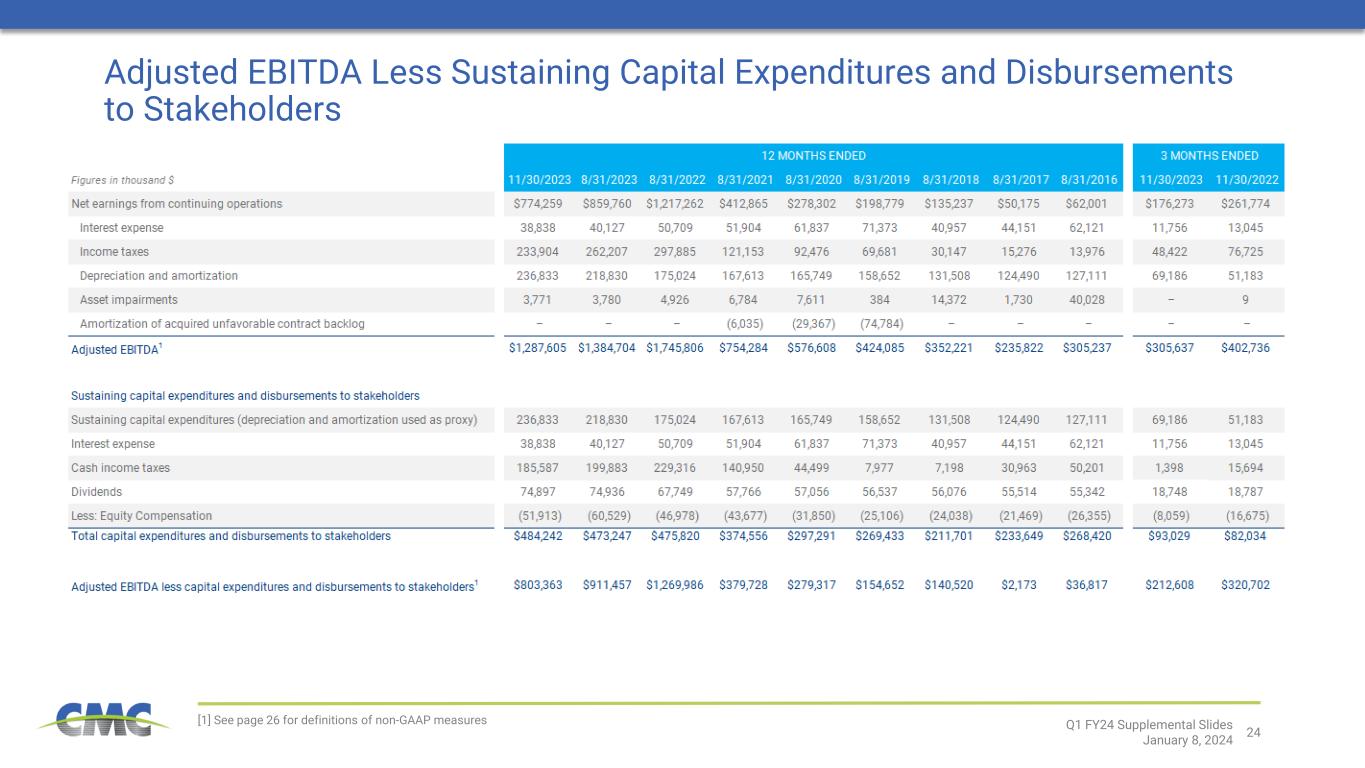 24 [1] See page 26 for definitions of non-GAAP measures Adjusted EBITDA Less Sustaining Capital Expenditures and Disbursements to Stakeholders Q1 FY24 Supplemental Slides January 8, 2024