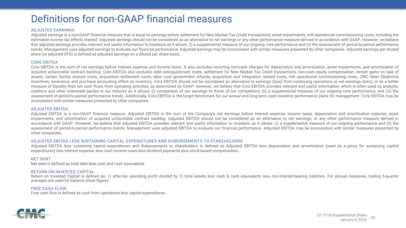 26 Definitions for non-GAAP financial measures ADJUSTED EARNINGS Adjusted earnings is a non-GAAP financial measure that is equal to earnings before settlement for New Market Tax Credit transactions, asset impairments, mill operational commissioning costs, including the estimated income tax effects thereof. Adjusted earnings should not be considered as an alternative to net earnings or any other performance measure derived in accordance with GAAP. However, we believe that adjusted earnings provides relevant and useful information to investors as it allows: (i) a supplemental measure of our ongoing core performance and (ii) the assessment of period-to-period performance trends. Management uses adjusted earnings to evaluate our financial performance. Adjusted earnings may be inconsistent with similar measures presented by other companies. Adjusted earnings per diluted share (or adjusted EPS) is defined as adjusted earnings on a diluted per share basis. CORE EBITDA Core EBITDA is the sum of net earnings before interest expense and income taxes. It also excludes recurring non-cash charges for depreciation and amortization, asset impairments, and amortization of acquired unfavorable contract backlog. Core EBITDA also excludes debt extinguishment costs, settlement for New Market Tax Credit transactions, non-cash equity compensation, certain gains on sale of assets, certain facility closure costs, acquisition settlement costs, labor cost government refunds, acquisition and integration related costs, mill operational commissioning costs, CMC Steel Oklahoma incentives, severance, and purchase accounting effect on inventory. Core EBITDA should not be considered an alternative to earnings (loss) from continuing operations or net earnings (loss), or as a better measure of liquidity than net cash flows from operating activities, as determined by GAAP. However, we believe that Core EBITDA provides relevant and useful information, which is often used by analysts, creditors and other interested parties in our industry as it allows: (i) comparison of our earnings to those of our competitors; (ii) a supplemental measure of our ongoing core performance; and (iii) the assessment of period-to-period performance trends. Additionally, Core EBITDA is the target benchmark for our annual and long-term cash incentive performance plans for management. Core EBITDA may be inconsistent with similar measures presented by other companies. ADJUSTED EBITDA Adjusted EBITDA is a non-GAAP financial measure. Adjusted EBITDA is the sum of the Company’s net earnings before interest expense, income taxes, depreciation and amortization expense, asset impairments, and amortization of acquired unfavorable contract backlog. Adjusted EBITDA should not be considered as an alternative to net earnings, or any other performance measure derived in accordance with GAAP. However, we believe that adjusted EBITDA provides relevant and useful information to investors as it allows: (i) a supplemental measure of our ongoing performance and (ii) the assessment of period-to-period performance trends. Management uses adjusted EBITDA to evaluate our financial performance. Adjusted EBITDA may be inconsistent with similar measures presented by other companies. ADJUSTED EBITDA LESS SUSTAINING CAPITAL EXPENDITURES AND DISBURSEMENTS TO STAKEHOLDERS Adjusted EBITDA less sustaining capital expenditures and disbursements to shareholders is defined as Adjusted EBITDA less depreciation and amortization (used as a proxy for sustaining capital expenditures) less interest expense, less cash income taxes less dividend payments plus stock-based compensation. NET DEBT Net debt is defined as total debt less cash and cash equivalents. RETURN ON INVESTED CAPITAL Return on Invested Capital is defined as: 1) after-tax operating profit divided by 2) total assets less cash & cash equivalents less non-interest-bearing liabilities. For annual measures, trailing 5-quarter averages are used for balance sheet figures. FREE CASH FLOW Free cash flow is defined as cash from operations less capital expenditures. Q1 FY24 Supplemental Slides January 8, 2024