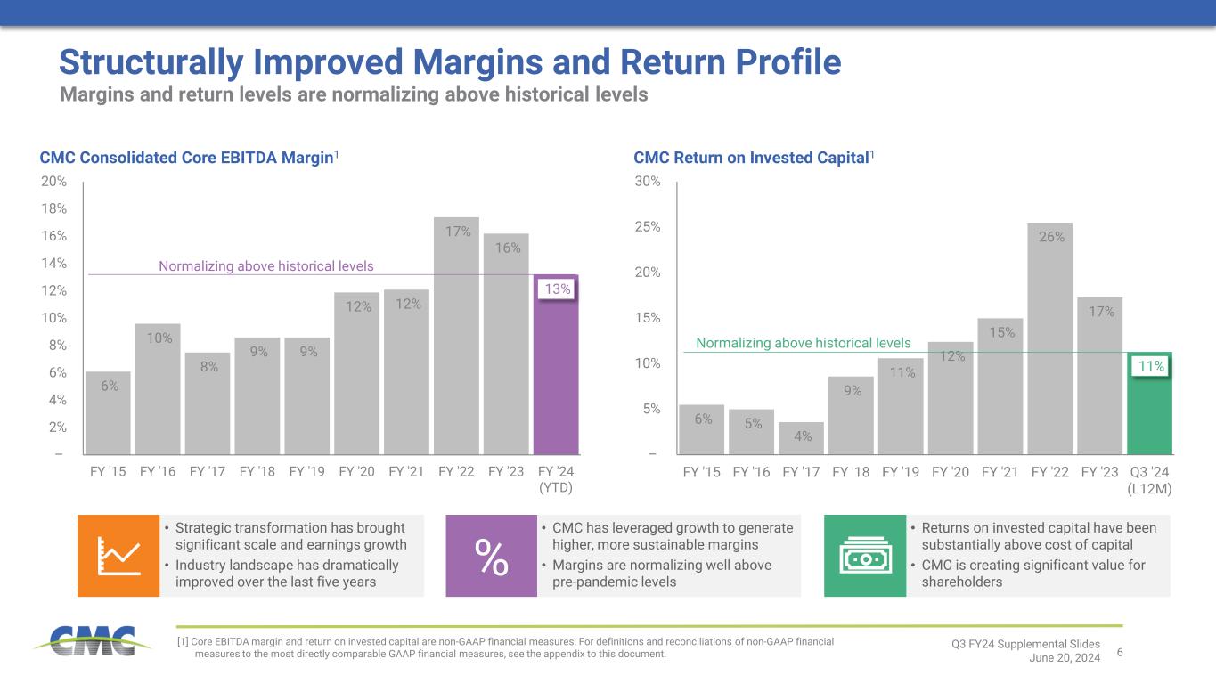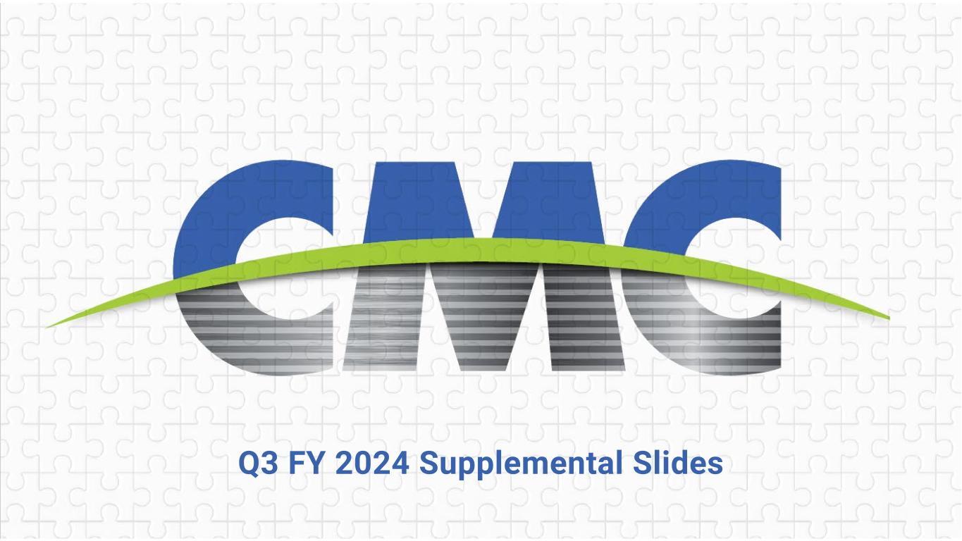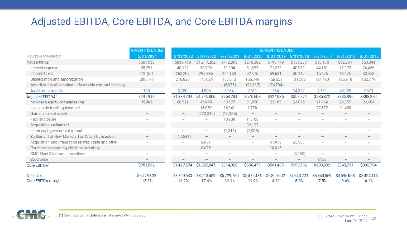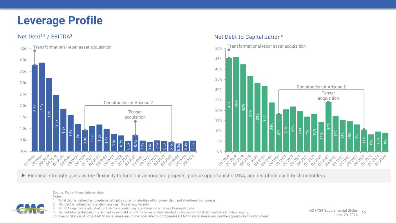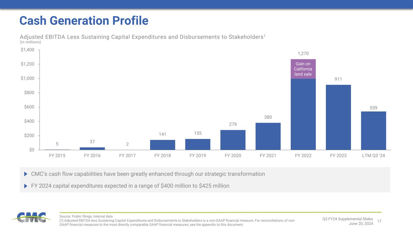 17 539 5 37 2 141 155 279 380 1,270 911 $0 $200 $400 $600 $800 $1,000 $1,200 $1,400 FY 2015 FY 2016 FY 2017 FY 2018 FY 2019 FY 2020 FY 2021 FY 2022 FY 2023 LTM Q3 '24 Cash Generation Profile Adjusted EBITDA Less Sustaining Capital Expenditures and Disbursements to Stakeholders1 (in millions) CMC’s cash flow capabilities have been greatly enhanced through our strategic transformation FY 2024 capital expenditures expected in a range of $400 million to $425 million Source: Public filings, Internal data [1] Adjusted EBITDA less Sustaining Capital Expenditures and Disbursements to Stakeholders is a non-GAAP financial measure. For reconciliations of non- GAAP financial measures to the most directly comparable GAAP financial measures, see the appendix to this document. Gain on California land sale Q3 FY24 Supplemental Slides June 20, 2024