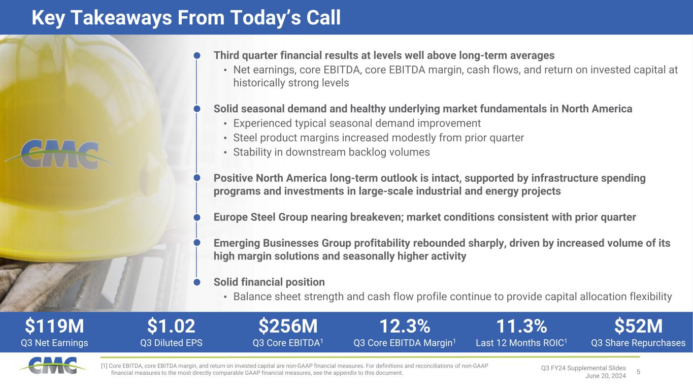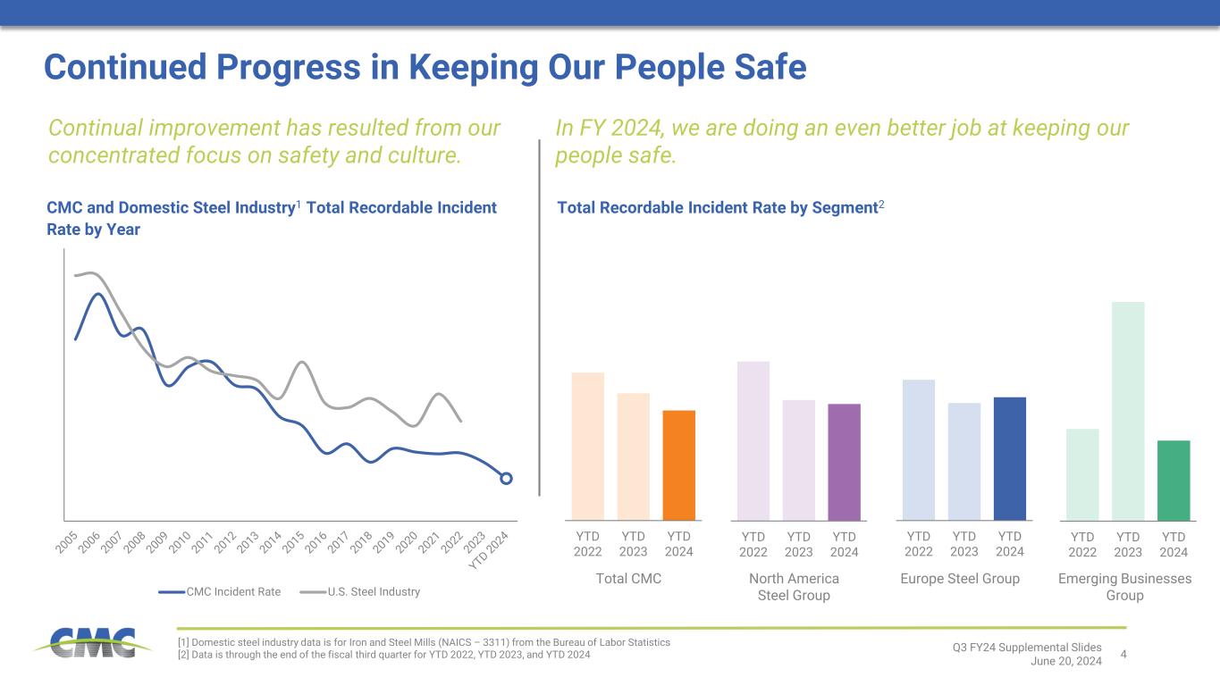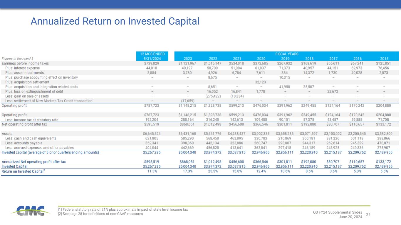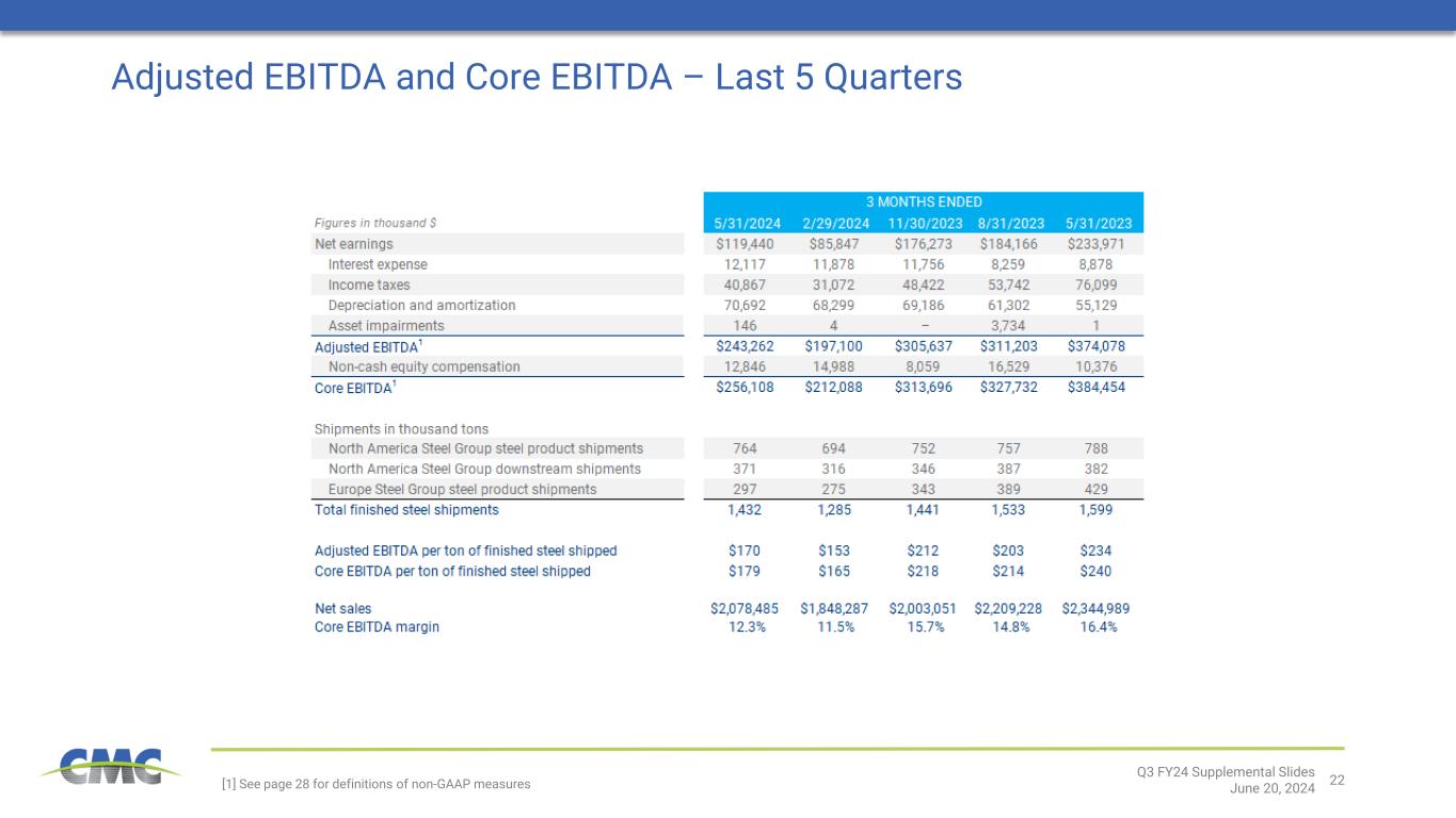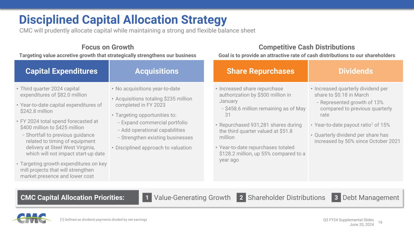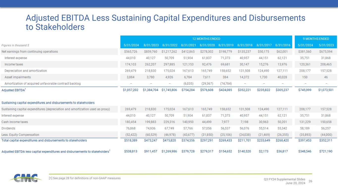 17 539 5 37 2 141 155 279 380 1,270 911 $0 $200 $400 $600 $800 $1,000 $1,200 $1,400 FY 2015 FY 2016 FY 2017 FY 2018 FY 2019 FY 2020 FY 2021 FY 2022 FY 2023 LTM Q3 '24 Cash Generation Profile Adjusted EBITDA Less Sustaining Capital Expenditures and Disbursements to Stakeholders1 (in millions) CMC’s cash flow capabilities have been greatly enhanced through our strategic transformation FY 2024 capital expenditures expected in a range of $400 million to $425 million Source: Public filings, Internal data [1] Adjusted EBITDA less Sustaining Capital Expenditures and Disbursements to Stakeholders is a non-GAAP financial measure. For reconciliations of non- GAAP financial measures to the most directly comparable GAAP financial measures, see the appendix to this document. Gain on California land sale Q3 FY24 Supplemental Slides June 20, 2024