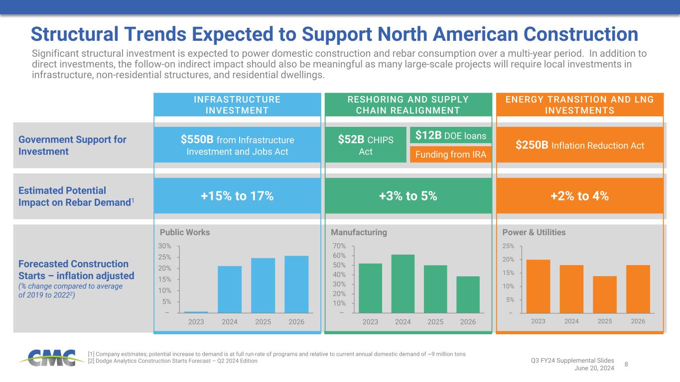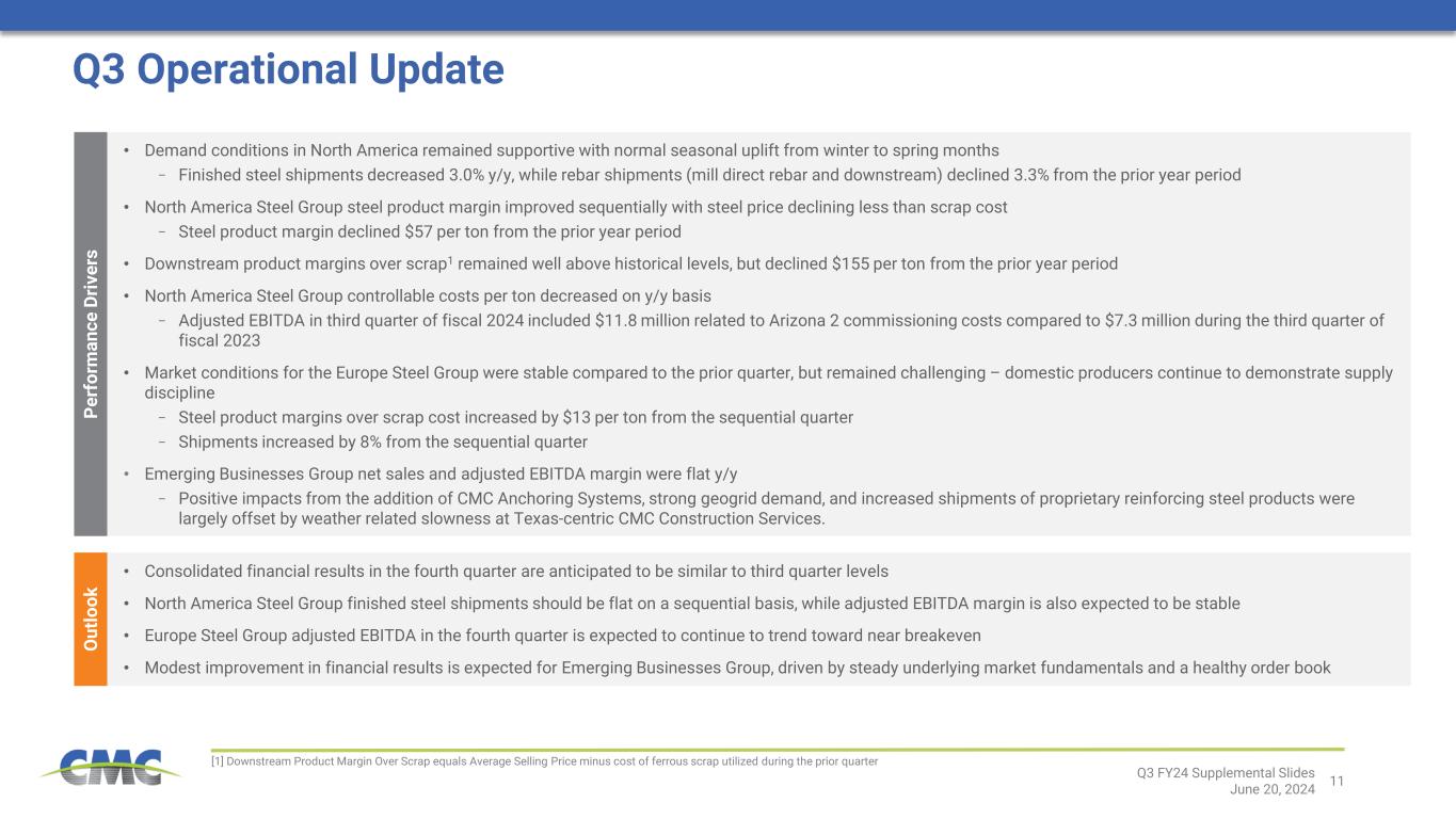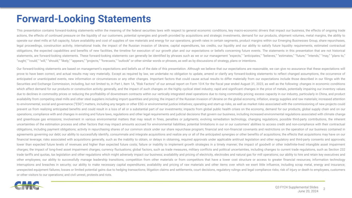 2Q3 FY24 Supplemental Slides June 20, 2024 This presentation contains forward-looking statements within the meaning of the federal securities laws with respect to general economic conditions, key macro-economic drivers that impact our business, the effects of ongoing trade actions, the effects of continued pressure on the liquidity of our customers, potential synergies and growth provided by acquisitions and strategic investments, demand for our products, shipment volumes, metal margins, the ability to operate our steel mills at full capacity, future availability and cost of supplies of raw materials and energy for our operations, growth rates in certain segments, product margins within our Emerging Businesses Group, share repurchases, legal proceedings, construction activity, international trade, the impact of the Russian invasion of Ukraine, capital expenditures, tax credits, our liquidity and our ability to satisfy future liquidity requirements, estimated contractual obligations, the expected capabilities and benefits of new facilities, the timeline for execution of our growth plan and our expectations or beliefs concerning future events. The statements in this presentation that are not historical statements, are forward-looking statements. These forward-looking statements can generally be identified by phrases such as we or our management “expects,” “anticipates,” “believes,” “estimates,” “future,” “intends,” “may,” “plans to,” “ought,” “could,” “will,” “should,” “likely,” “appears,” “projects,” “forecasts,” “outlook” or other similar words or phrases, as well as by discussions of strategy, plans or intentions. Our forward-looking statements are based on management’s expectations and beliefs as of the date of this presentation. Although we believe that our expectations are reasonable, we can give no assurance that these expectations will prove to have been correct, and actual results may vary materially. Except as required by law, we undertake no obligation to update, amend or clarify any forward-looking statements to reflect changed assumptions, the occurrence of anticipated or unanticipated events, new information or circumstances or any other changes. Important factors that could cause actual results to differ materially from our expectations include those described in our filings with the Securities and Exchange Commission, including, but not limited to, in Part I, Item 1A, “Risk Factors” of our annual report on Form 10-K for the fiscal year ended August 31, 2023, as well as the following: changes in economic conditions which affect demand for our products or construction activity generally, and the impact of such changes on the highly cyclical steel industry; rapid and significant changes in the price of metals, potentially impairing our inventory values due to declines in commodity prices or reducing the profitability of downstream contracts within our vertically integrated steel operations due to rising commodity pricing; excess capacity in our industry, particularly in China, and product availability from competing steel mills and other steel suppliers including import quantities and pricing; the impact of the Russian invasion of Ukraine on the global economy, inflation, energy supplies and raw materials; increased attention to environmental, social and governance (“ESG”) matters, including any targets or other ESG or environmental justice initiatives; operating and start-up risks, as well as market risks associated with the commissioning of new projects could prevent us from realizing anticipated benefits and could result in a loss of all or a substantial part of our investments; impacts from global public health crises on the economy, demand for our products, global supply chain and on our operations; compliance with and changes in existing and future laws, regulations and other legal requirements and judicial decisions that govern our business, including increased environmental regulations associated with climate change and greenhouse gas emissions; involvement in various environmental matters that may result in fines, penalties or judgments; evolving remediation technology, changing regulations, possible third-party contributions, the inherent uncertainties of the estimation process and other factors that may impact amounts accrued for environmental liabilities; potential limitations in our or our customers' abilities to access credit and non-compliance with their contractual obligations, including payment obligations; activity in repurchasing shares of our common stock under our share repurchase program; financial and non-financial covenants and restrictions on the operation of our business contained in agreements governing our debt; our ability to successfully identify, consummate and integrate acquisitions and realize any or all of the anticipated synergies or other benefits of acquisitions; the effects that acquisitions may have on our financial leverage; risks associated with acquisitions generally, such as the inability to obtain, or delays in obtaining, required approvals under applicable antitrust legislation and other regulatory and third-party consents and approvals; lower than expected future levels of revenues and higher than expected future costs; failure or inability to implement growth strategies in a timely manner; the impact of goodwill or other indefinite-lived intangible asset impairment charges; the impact of long-lived asset impairment charges; currency fluctuations; global factors, such as trade measures, military conflicts and political uncertainties, including changes to current trade regulations, such as Section 232 trade tariffs and quotas, tax legislation and other regulations which might adversely impact our business; availability and pricing of electricity, electrodes and natural gas for mill operations; our ability to hire and retain key executives and other employe